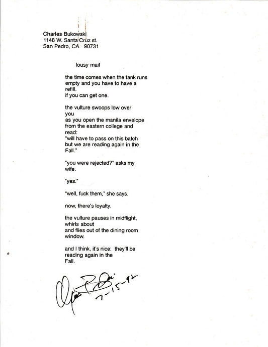 Lousy mail: Signed Charles Bukowski Poem that Appeared in “Come On In”