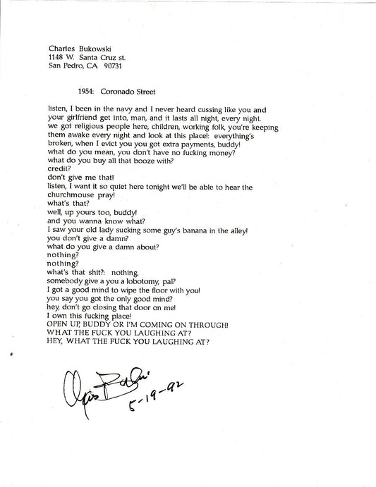 1954: Coronado Street -- Signed, Uncollected Poem by Charles Bukowski