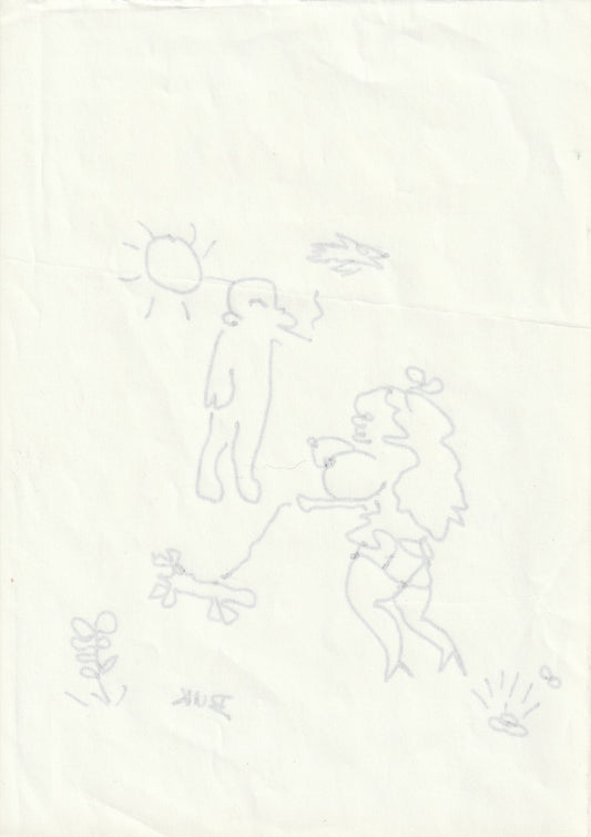 Signed Original Drawing by Charles Bukowski of Topless Woman Walking a Dog