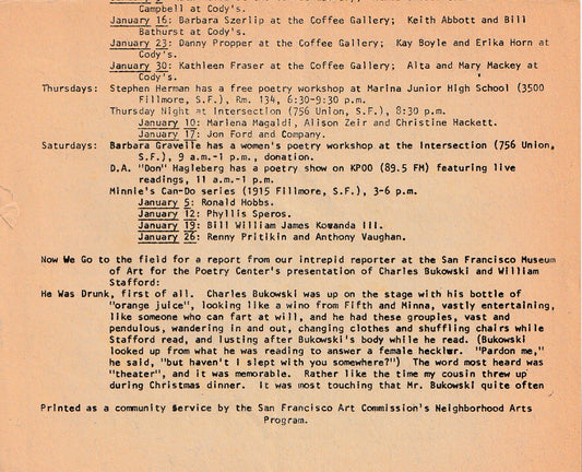 Poetry Flash Review -- Hilarious Review of Bukowski’s 1973 Reading with William Stafford at the San Francisco Museum of Art (1974)