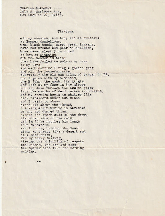Early Original Typescript: Fly-Song by Charles Bukowski