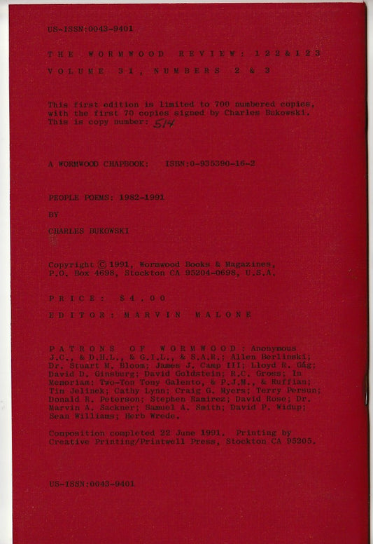 Wormwood Review 122/123 #165/700 -- Charles Bukowski Chapbook People Poems, 43 Poems, Five Uncollected (1991)