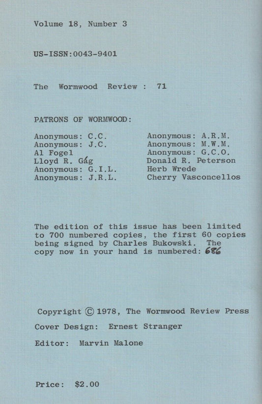 Wormwood Review 71 #686/700 -- Charles Bukowski Chapbook with 41 Poems, Nine Uncollected (1978)