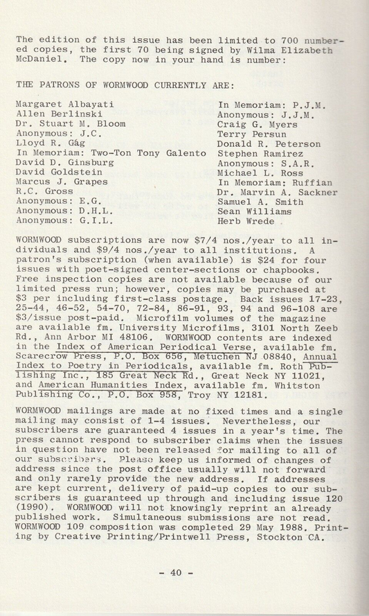 Wormwood Review 90 #302/700 — 1 Poem by Charles Bukowski