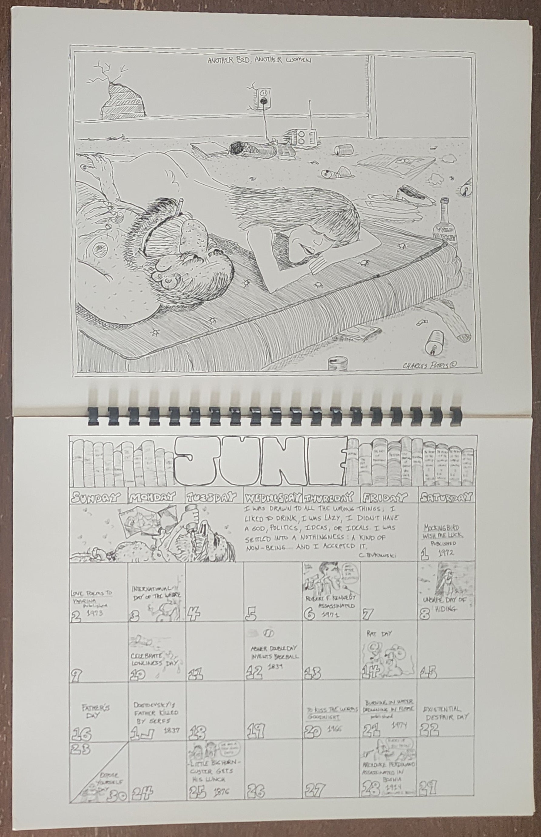 The spiral-bound calendar features a full-page illustration for each month spoofing a day-in-the-life of Bukowski's lifestyle. Individual dates on the calendar itself cite important moments in Bukowski's life and other events in literary and pop-culture history.