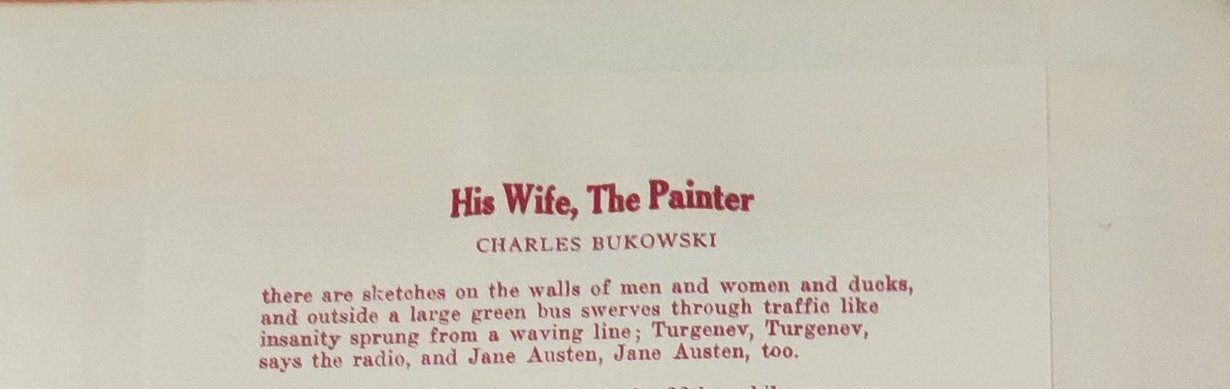 As issued, the bibliography contains a tipped-in facsimile of Bukowski's second separate publication, a broadside printing of "His Wife, The Painter." This was originally issued as Hearse Broadside No. 1 in 1960.