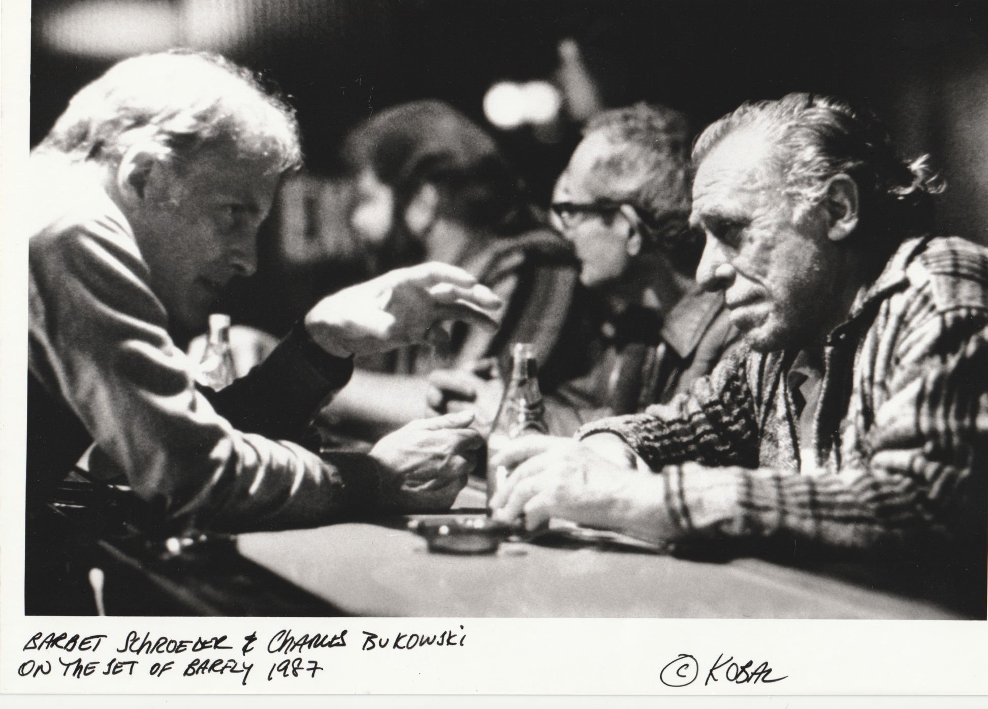 This is a beautiful photograph of Barbet Schroeder and Charles Bukowski on the set of Barfly in 1987. Bukowski did a cameo in the movie sitting at the bar.