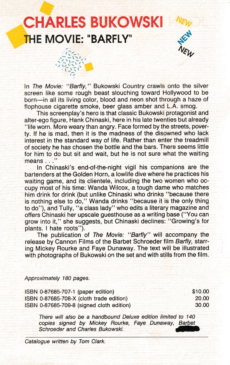 Published in 1987 by Black Sparrow Press to coincide with the film, this is the First Hardcover Trade edition of the screenplay for Barfly.