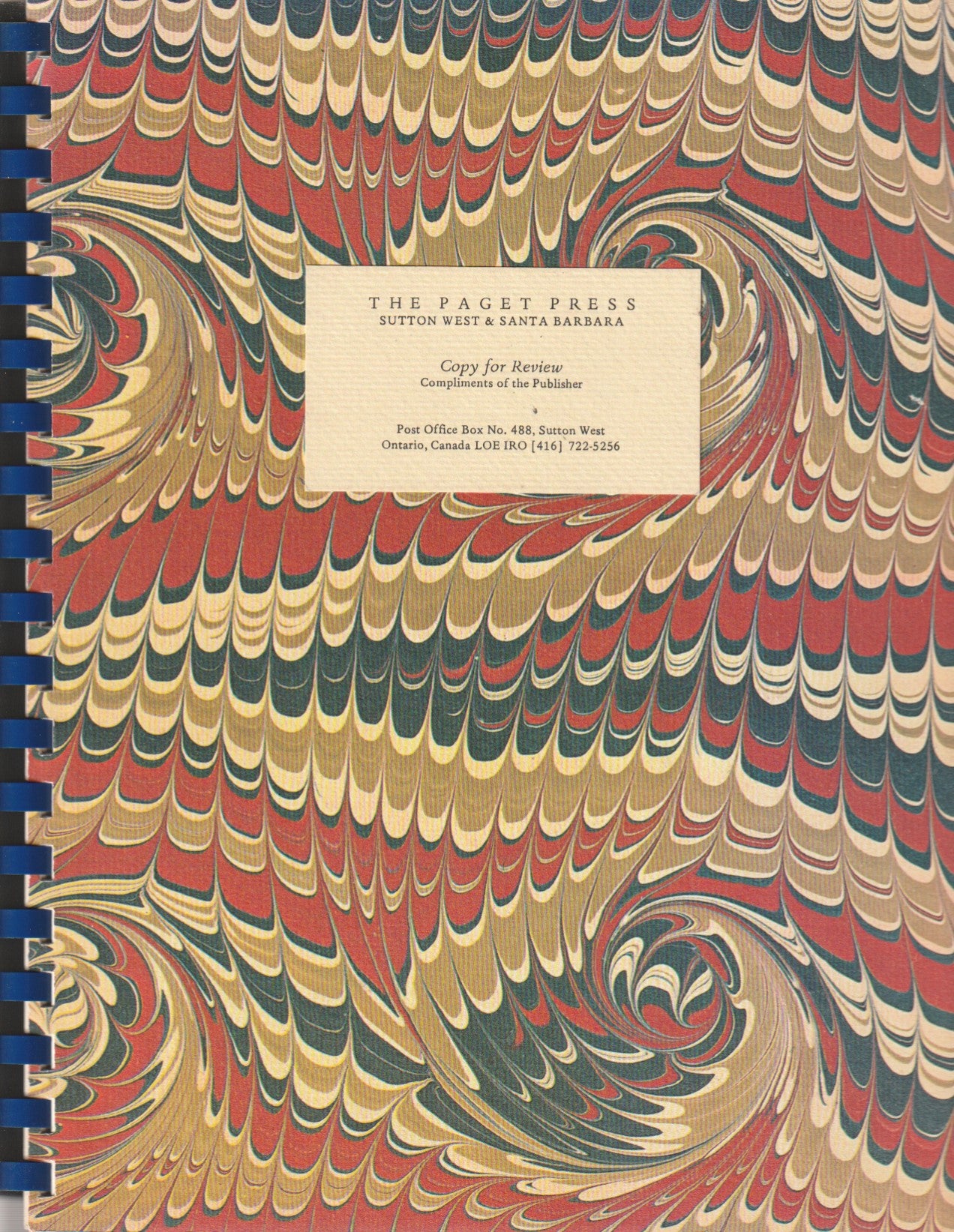 For a Proof copy, this is really well produced. Although it has a comb binding, the marbled covers are beautifully printed on heavy stock. Without the comb binding, the cover and the sheets measure approximately 11” x 8.5”.