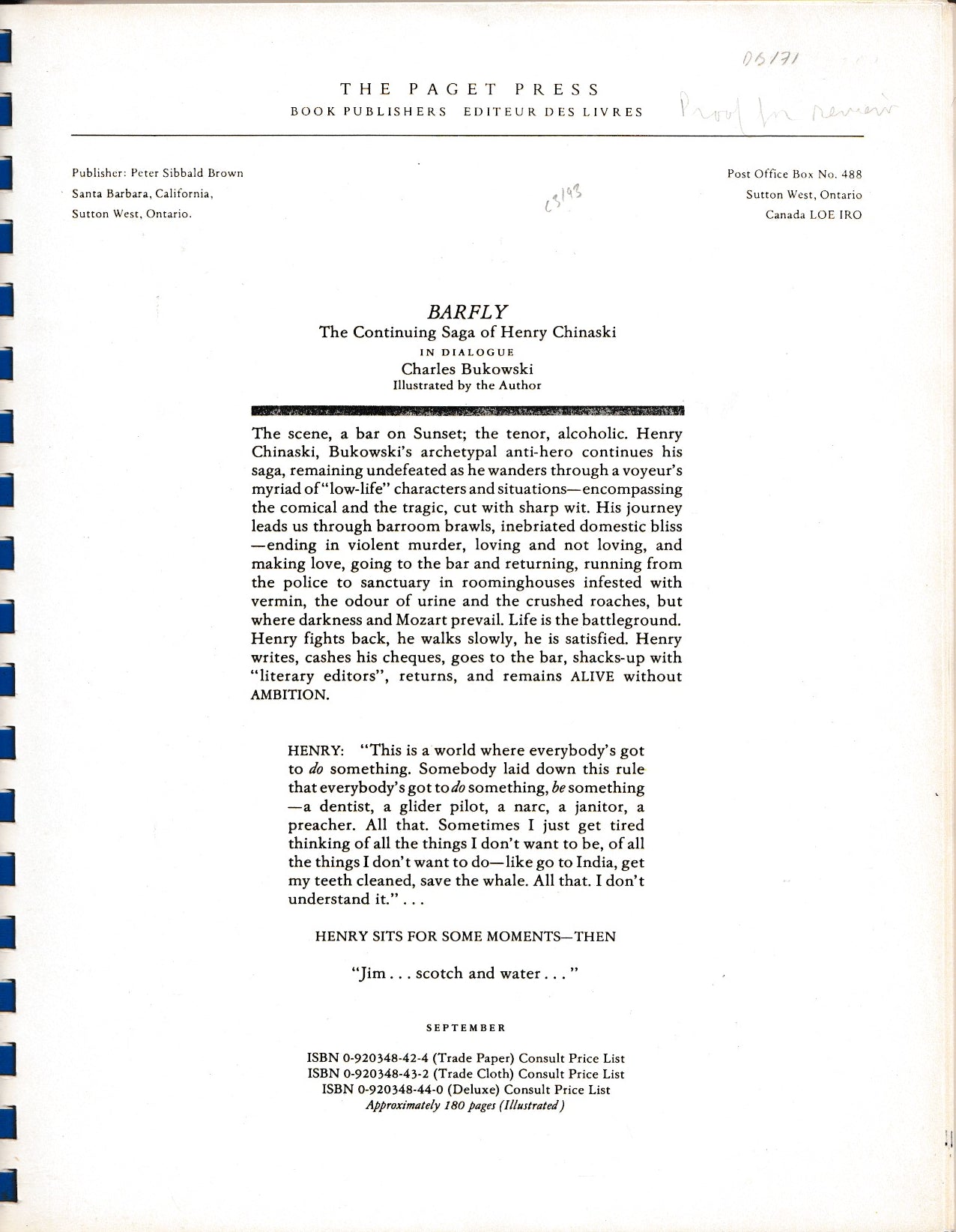 This is a rare uncorrected proof of Charle Bukowski’s screenplay Barfly. It is the original screenplay for the film that was published by Paget Press (Sutton West) in 1984, preceding the Black Sparrow Press edition by three years.