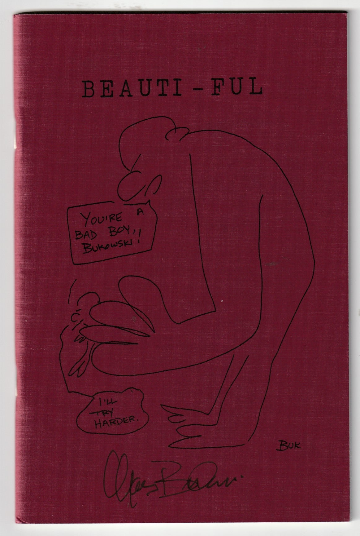 Published in 1988, this is the Deluxe edition of Wormwood Review 110/111, which was given the name BEAUTI-FUL. It is one of 75 copies signed by Charles Bukowski, this one being hnd-numbered “twenty one”.