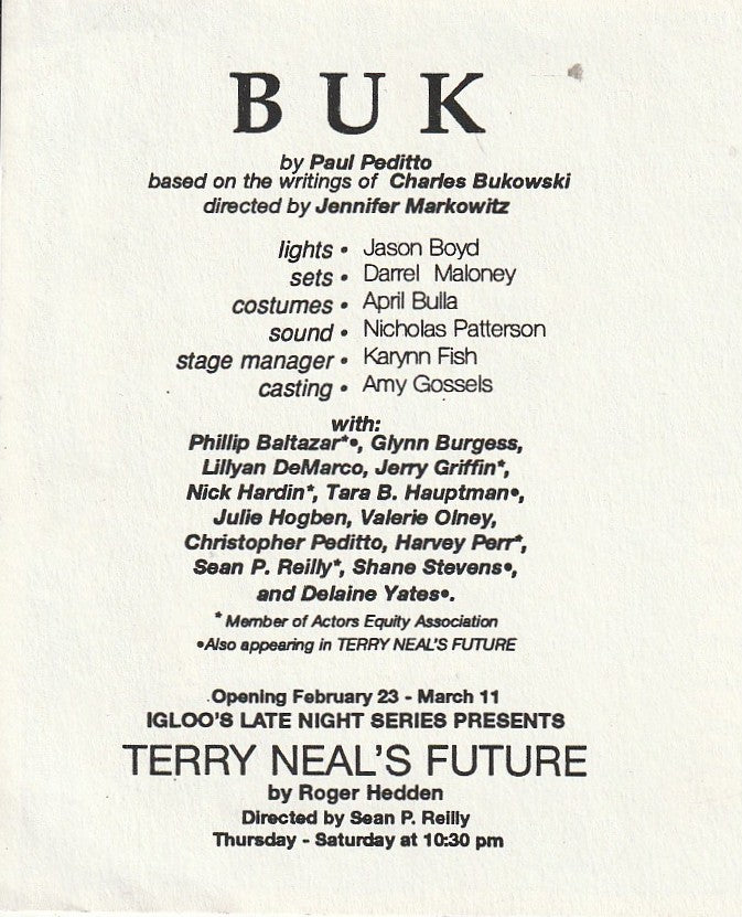 This is a flyer for the 2010 production of BUK The Life and Times of Charles Bukowski.