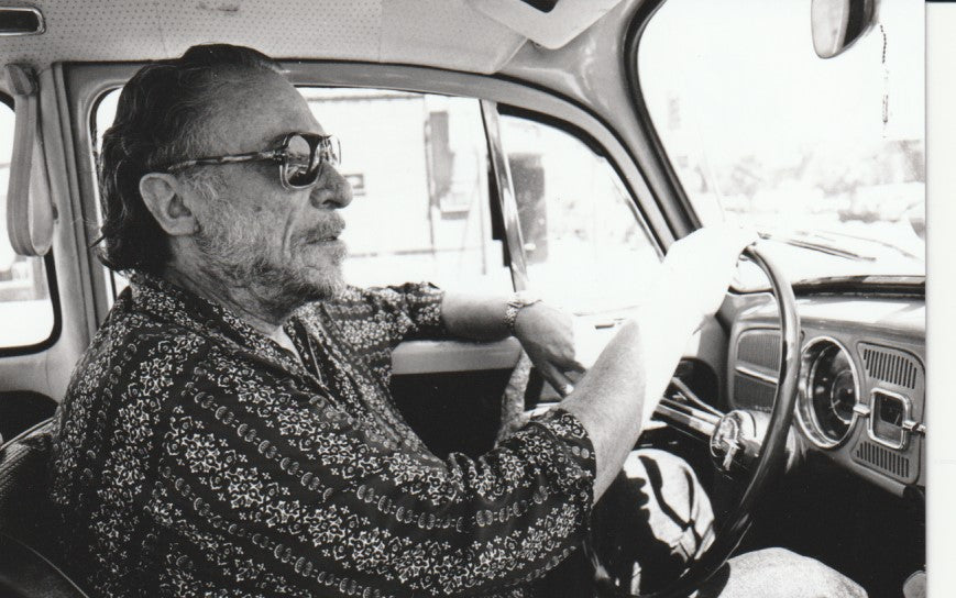 It shows Bukowski driving his beloved Volkswagen Beetle.