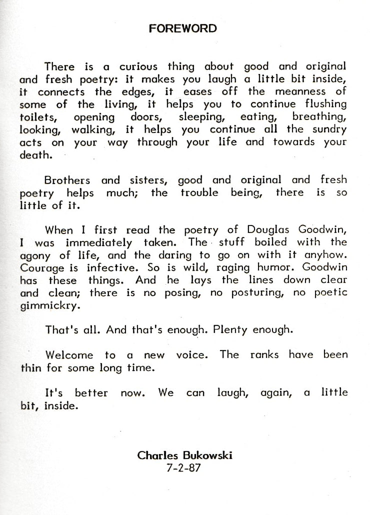 I’ve read some of the early letters between Douglas Good win and Charles Bukowski, and it’s clear that Bukowski took a shine to both the poetry and the poet.