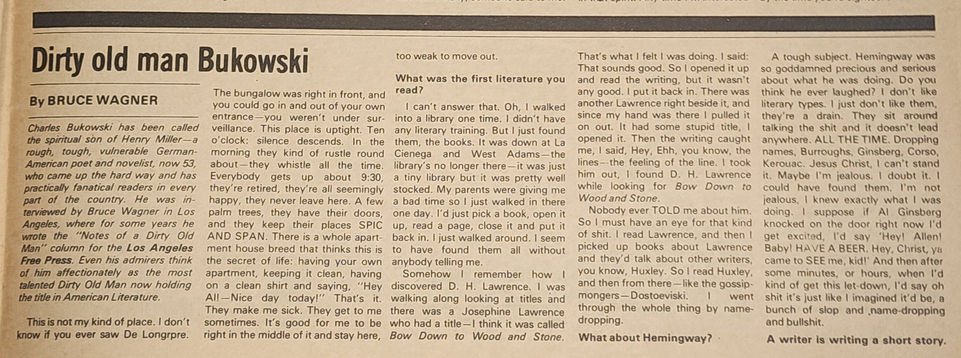 Despite the lame title, it's a solid Bukowski interview that touches on subjects I have not read elsewhere. The interviewer was not prepared for Bukowski, who toys with him like a cat.