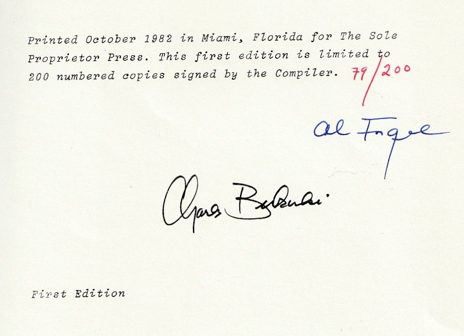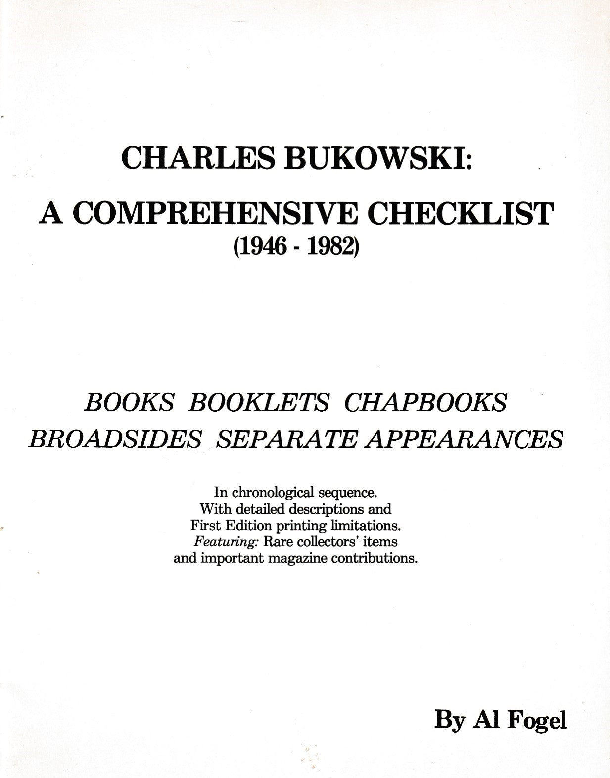 Published in 1982 by the Sole Proprietor Press out of Miami, Florida, this is the first edition of Al Fogel’s Charles Bukowski: A Comprehensive Checklist.