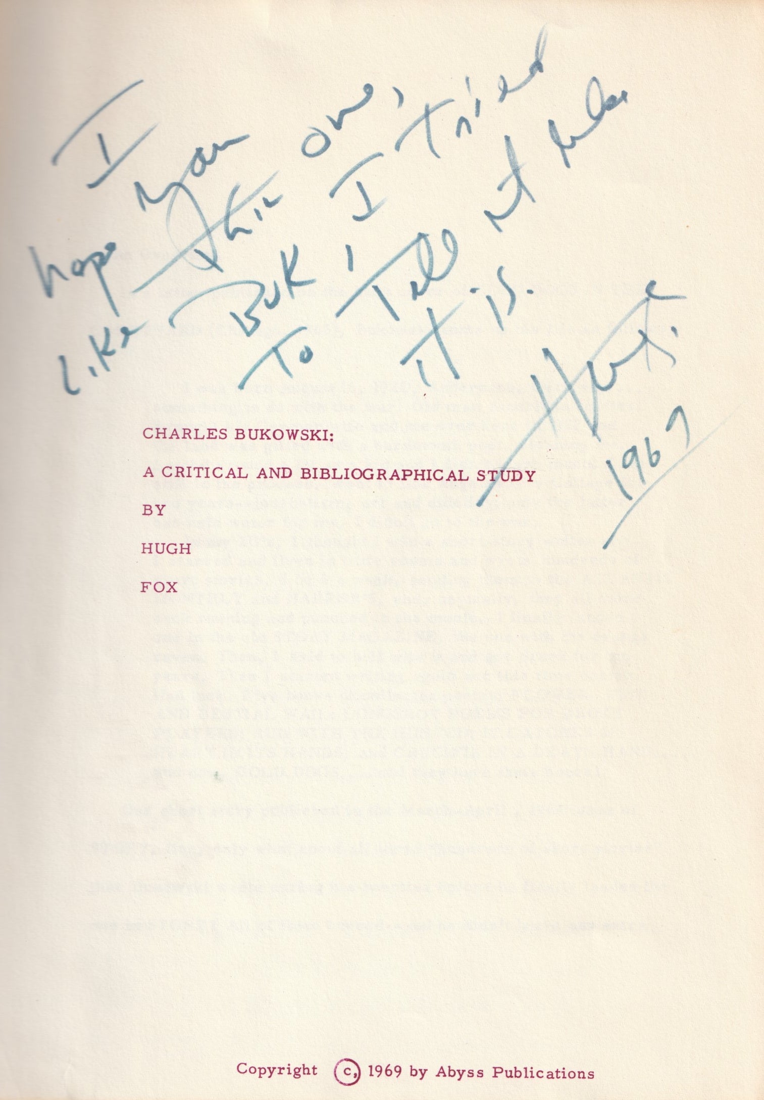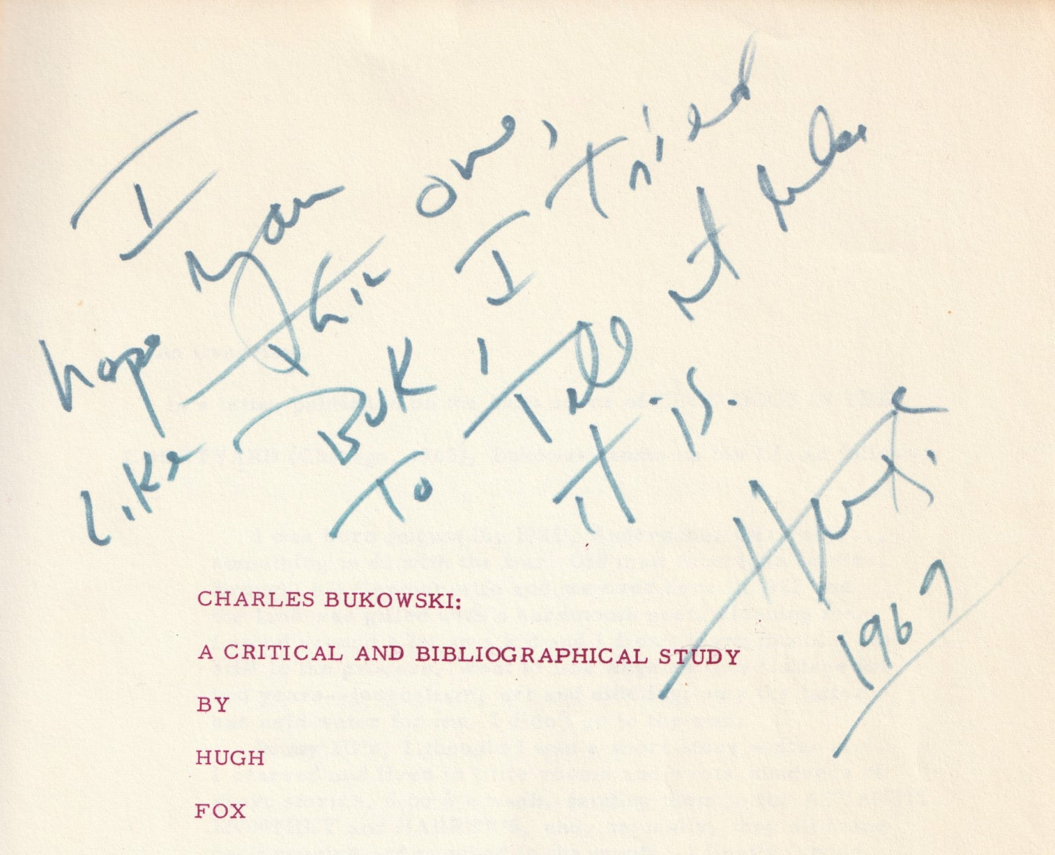 This is Bukowski’s personal copy, inscribed to him by Fox:
