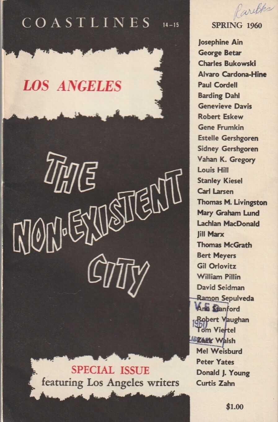 Published in the Spring of 1960, this special Issue from Coastlines featured Los Angeles writers. Bukowski’s three poems are all first appearances: