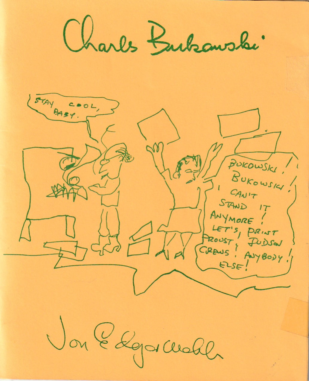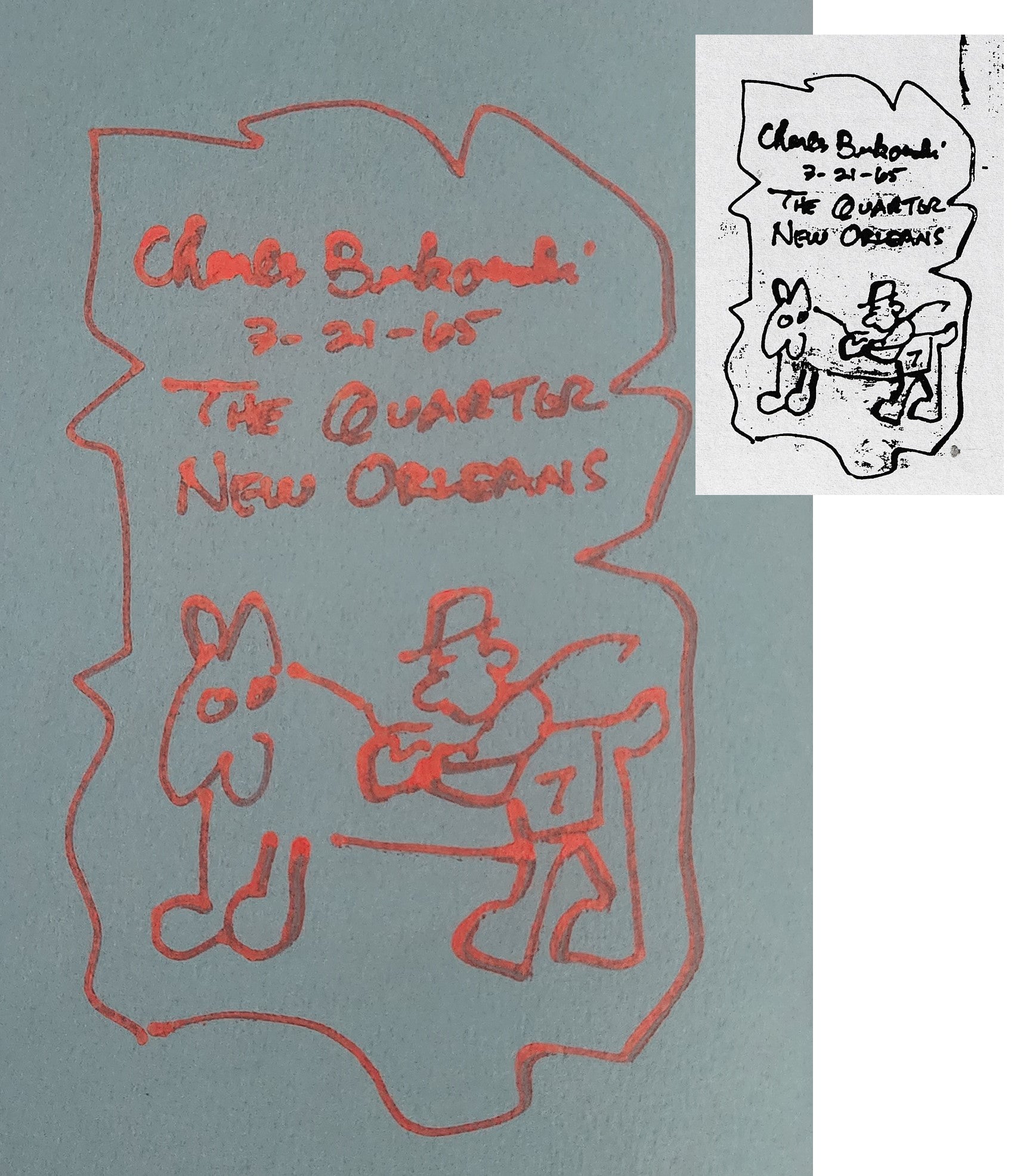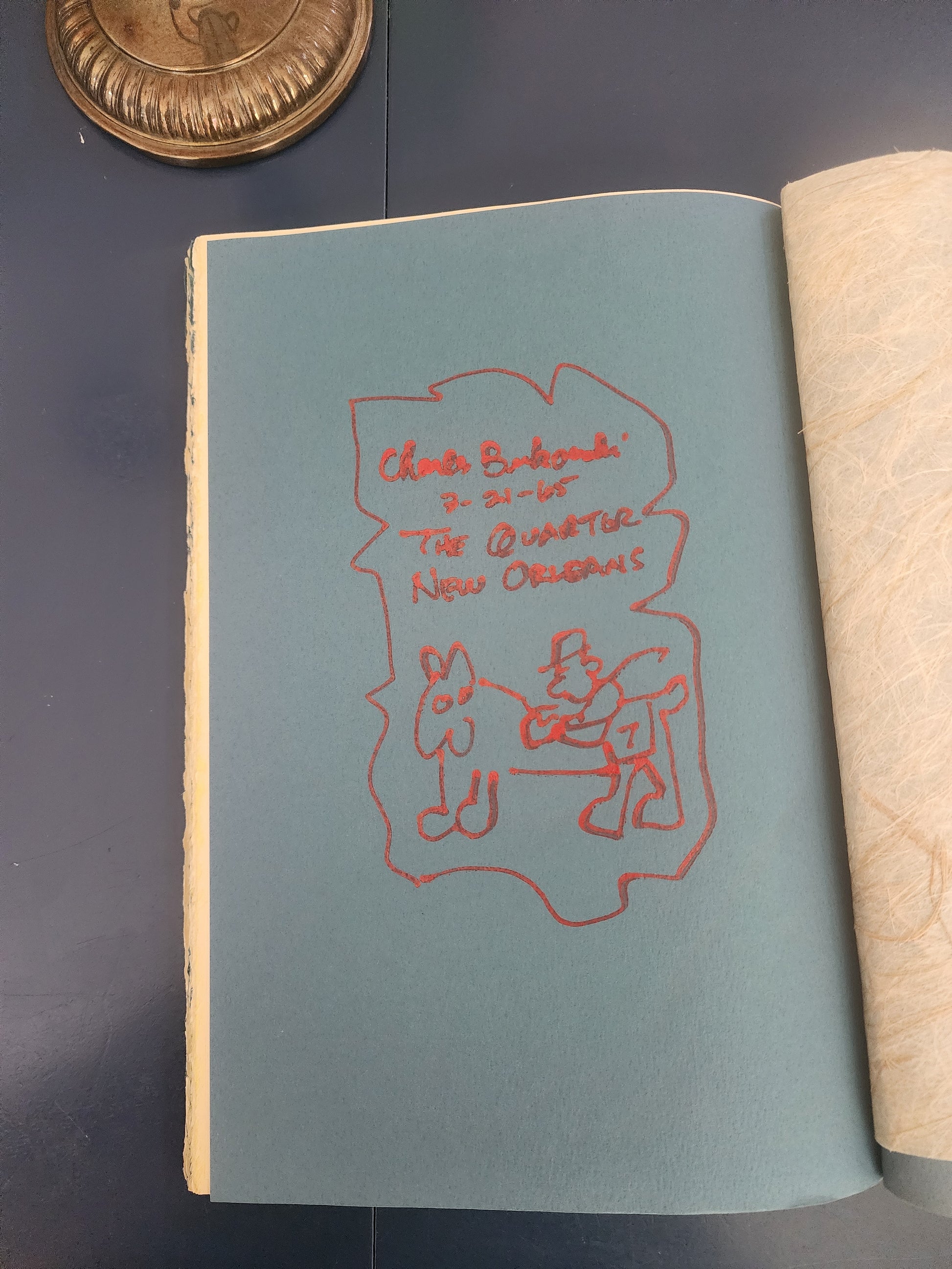 This copy of Crucifix in a Deathhand was featured in the sales catalog, with a photograph of the drawing and a description that talks about Bukowski going to the track while he was visiting the Webb’s in New Orleans. The catalog, 1/250 copies produced, is included here with the book itself.
