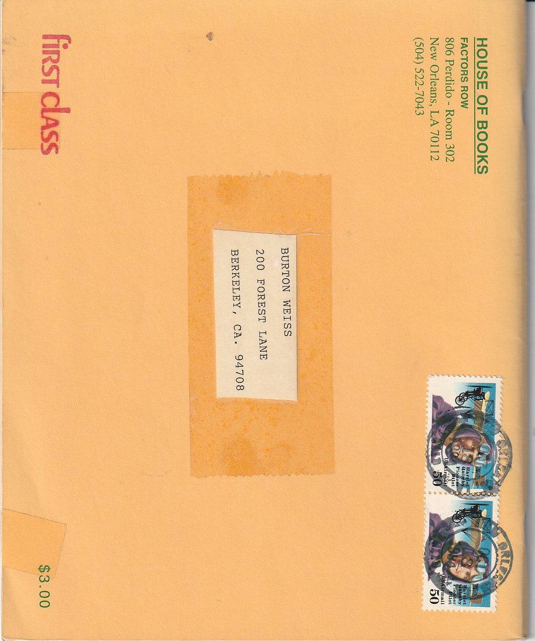 The catalog was mailed to Berkeley, California, at the time of the sale. There are postage stamps on the rear, a first class red stamp, and clear tape adhering to the label of the recipient’s address. The catalog was sealed by tape on both covers and the remnants are still present.