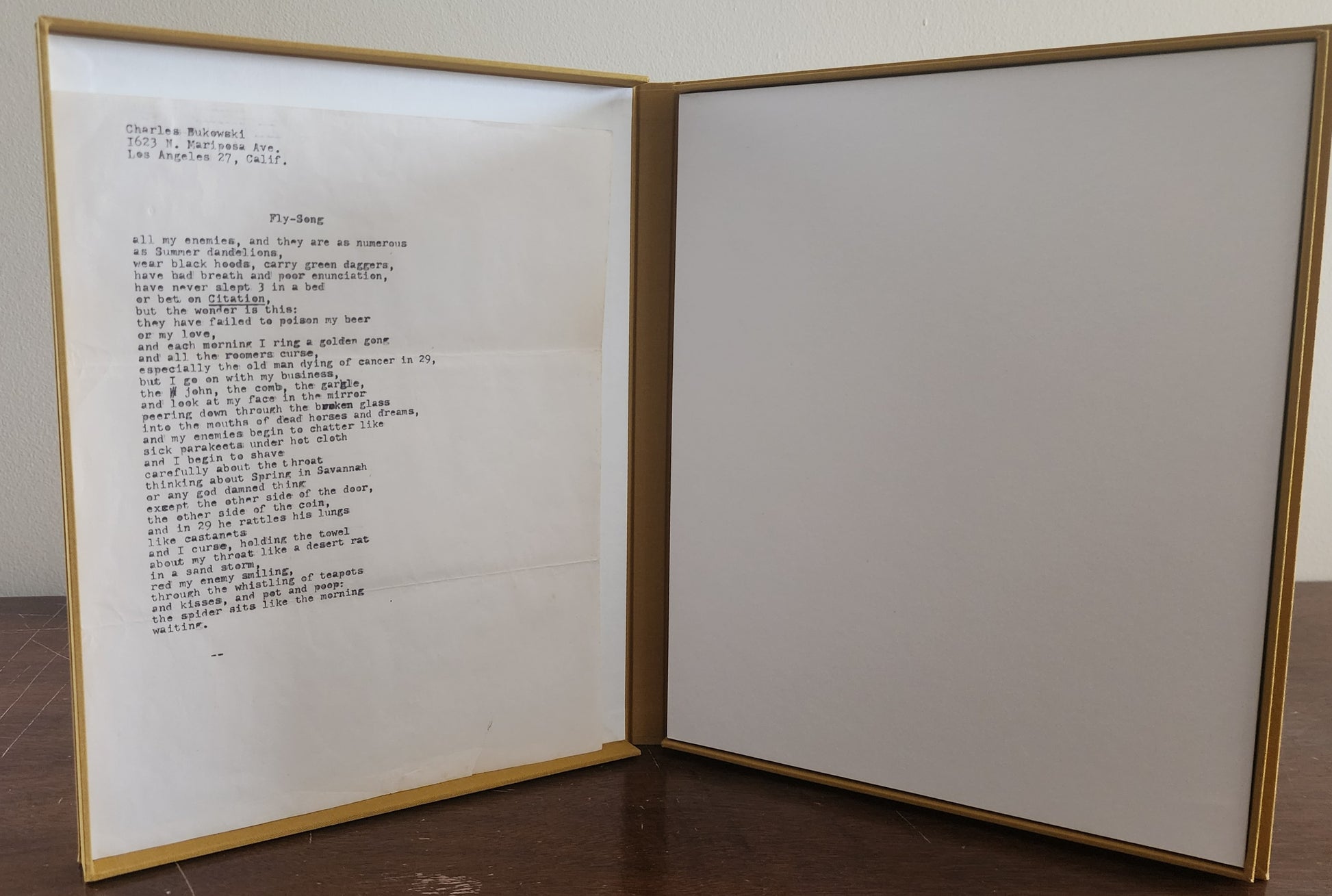 This is a very early typescript of Charles Bukowski poem that should probably be in a university archive. Titled, Fly-Song, the poem has never been published.
