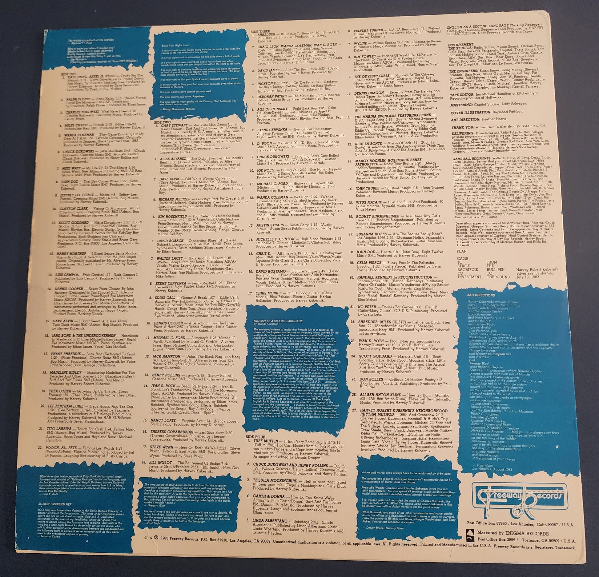 Published in 1983 by Freeway Records and Enigma Records, English As A Second Language (Talking Package) features poetry and spoken word by Charles Bukowski, Henry Rollins, Chuck Dukowski, Mike Watt, Dave Alvin, Wanda Coleman, Steve Wynn and many more.