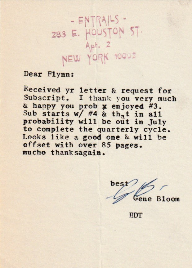 This copy comes with a typed signed letter from editor Gene Bloom describing this forthcoming issue.