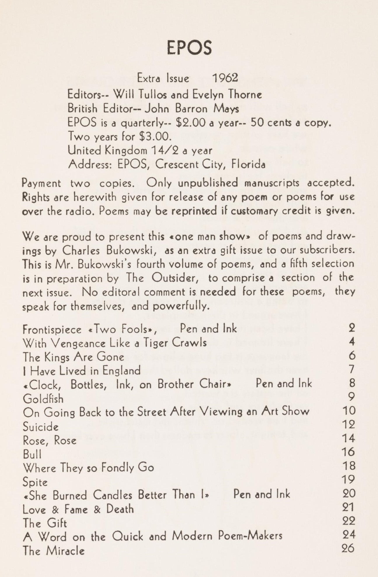 EPOS: A Quarterly of Poetry was a journal edited by Evelyn Thorne and Will Tullos out of Cresent City, Florida. The first issue appeared in Fall 1949 and was published until the 1970s. Bukowski would appear in 12 issues of EPOS between 1959 and 1970.