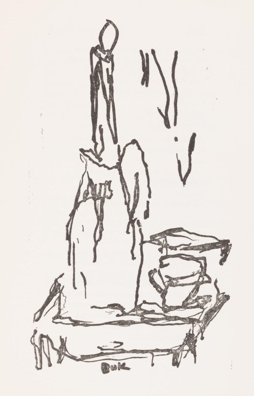 In addition to the poems listed below, there are three printed drawings, two of which are also quite different in style from other Bukowski drawings. They have an almost antiquity feel in their composition.