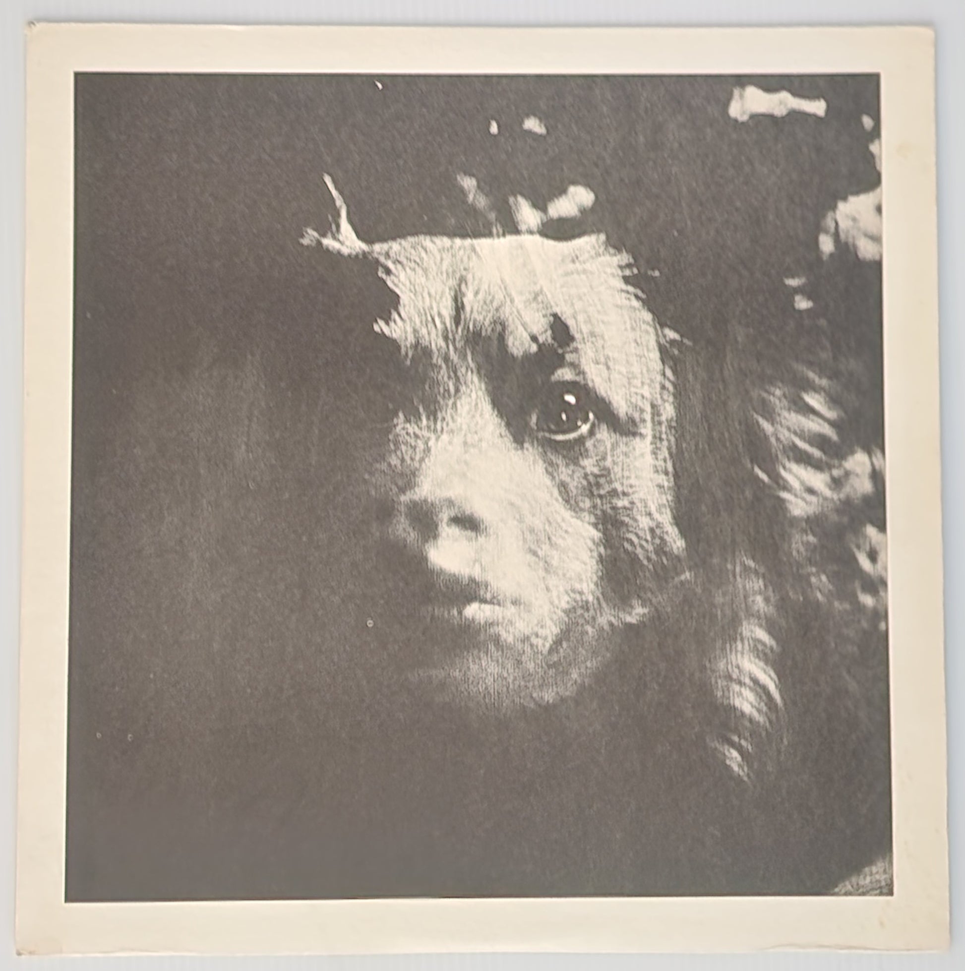 There are two versions of the cover. This is the version with photographic image of what appears to be a human face imposed on a dog’s face. Some say it’s a bat, others say it’s all three. On the back cover, it reads: