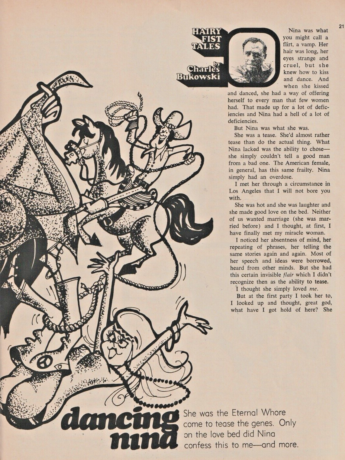 The January 1972 issue of Fling (Vol. 14, No. 6) features the Charles Bukowski short story, Dancing Nina. The short story is about his lover (at the time) Linda King.