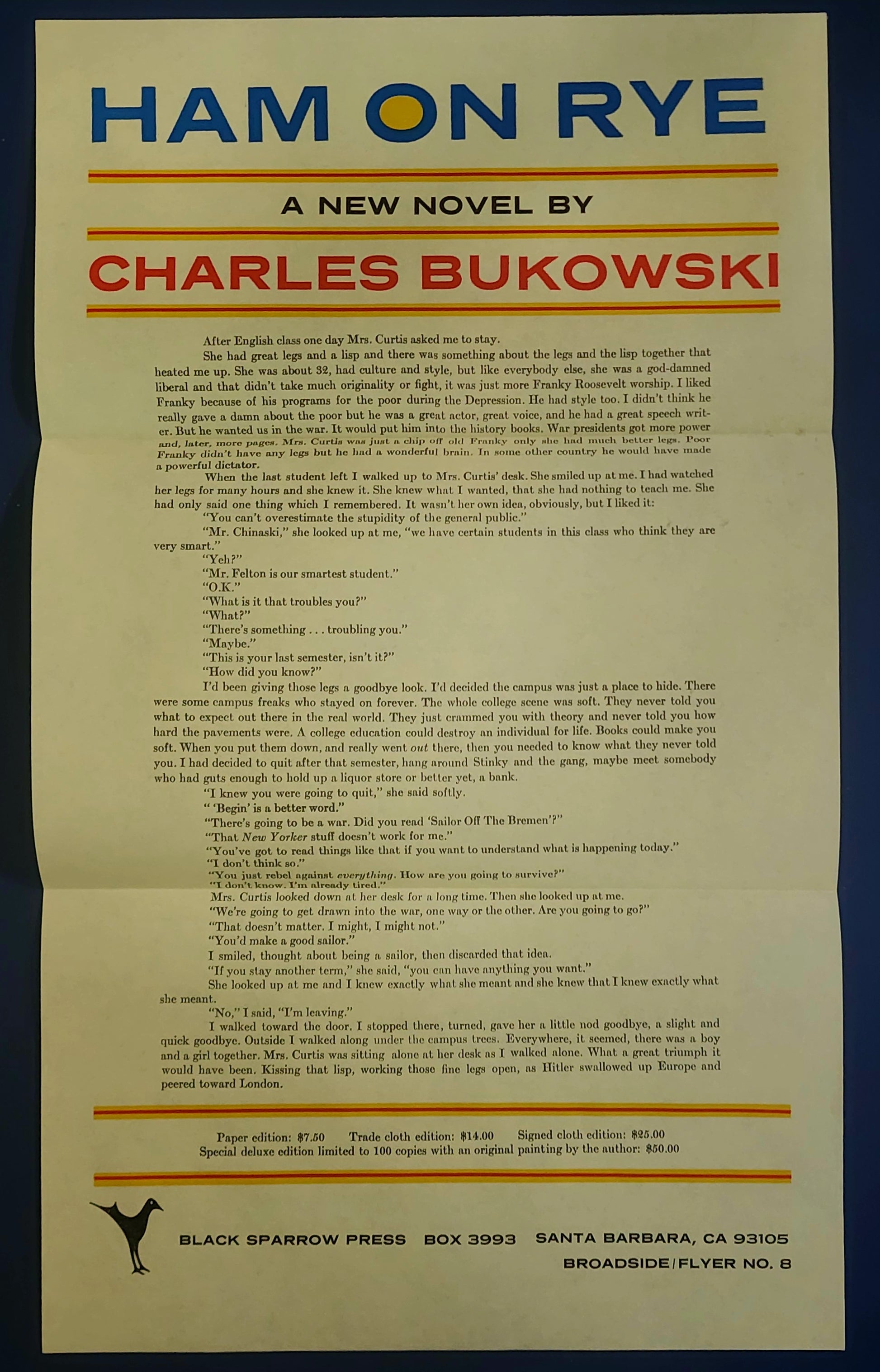The book comes with the flyer for the book, which is also in Fine condition with two folds as issued for mailing. It’s a very large broadside, measuring 17 x 10 and features features a great excerpt from the novel where Chinaski tells his teacher he’s dropping out of college.
