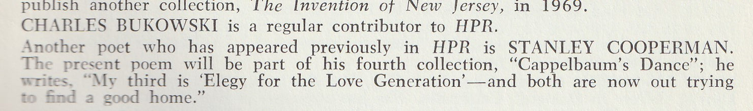 Still around today, The Hiram Poetry Review was founded in 1966 by Hiram College English professor Hale Chatfield. The journal played an important role in establishing Bukowski’s career, whose work appeared frequently in the journal between 1966 and 1969.