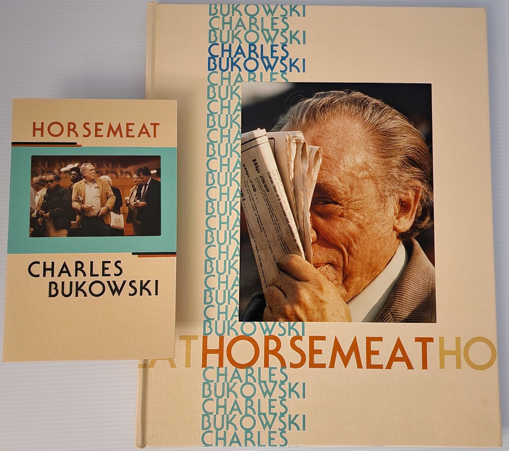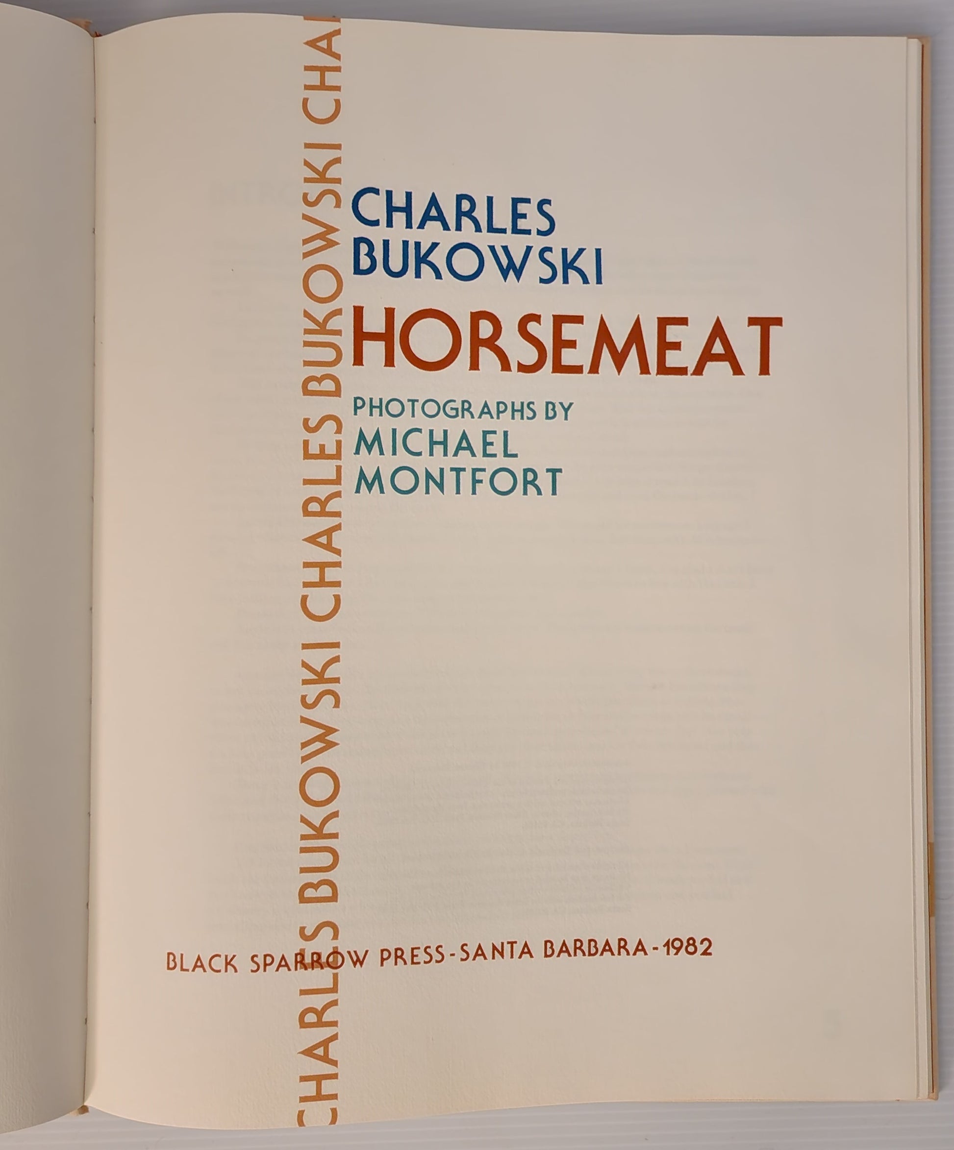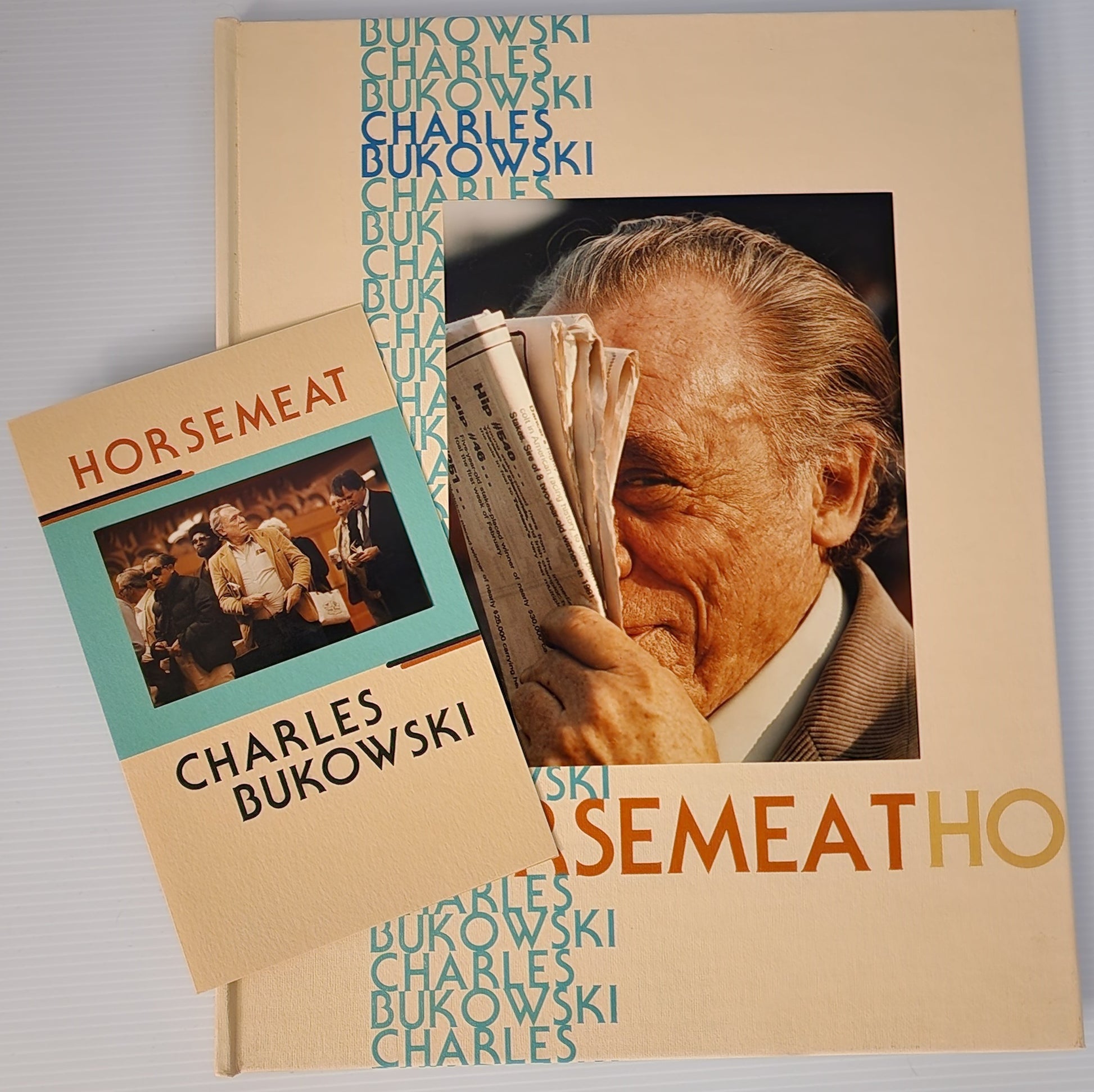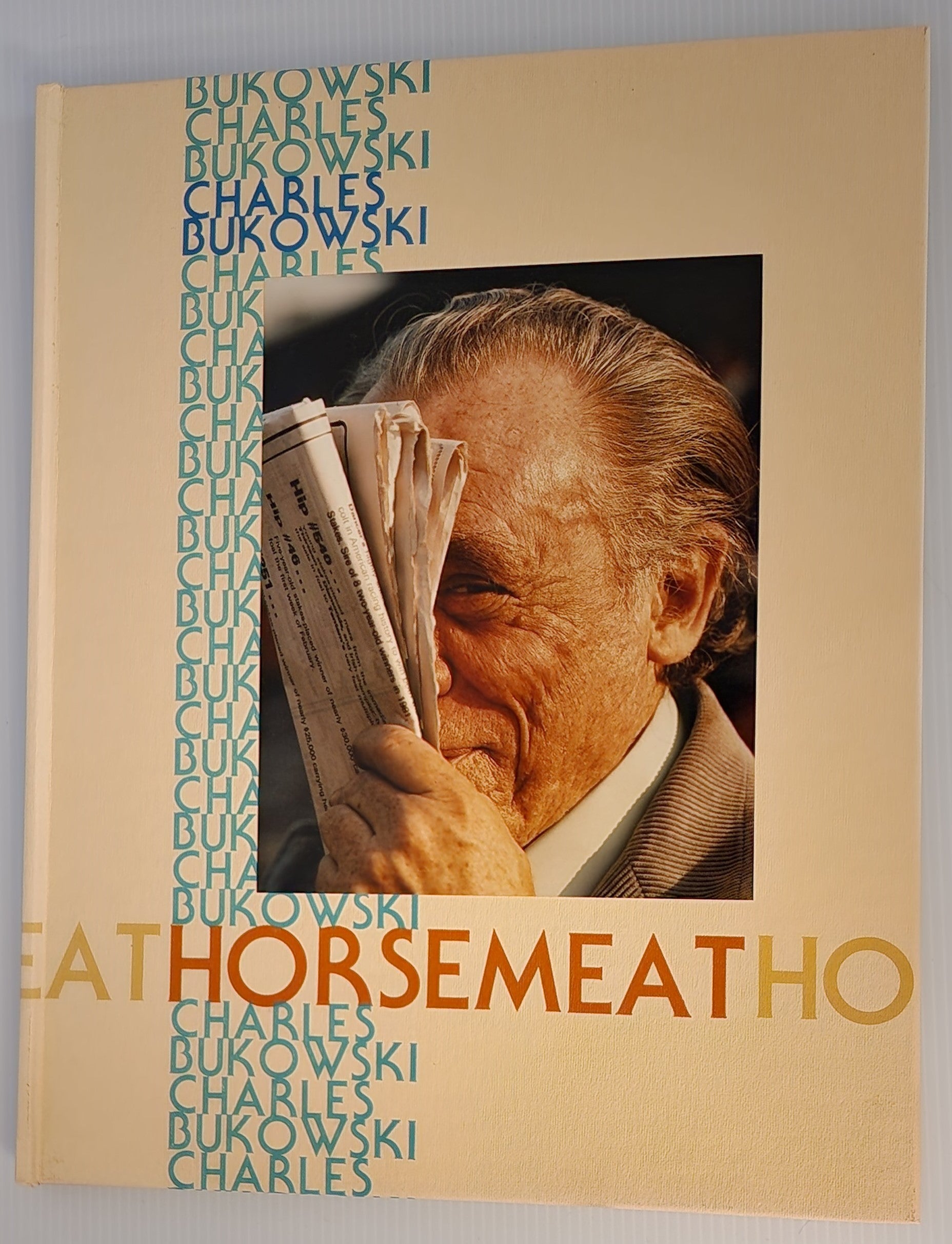 Published in 1982, Horsemeat contains 20 tipped-in photographs capturing a day at the track with Bukowski. It measures approximately 11.25” x 14 .25” and runs 50 pages. There is also a mounted photograph of Bukowski on the front cover.