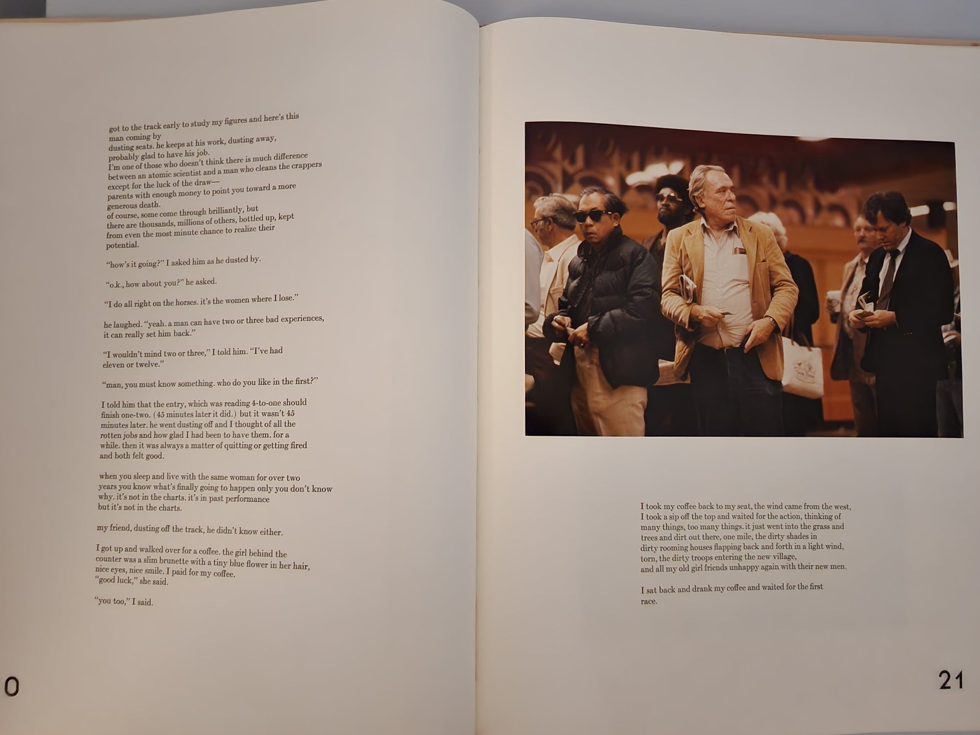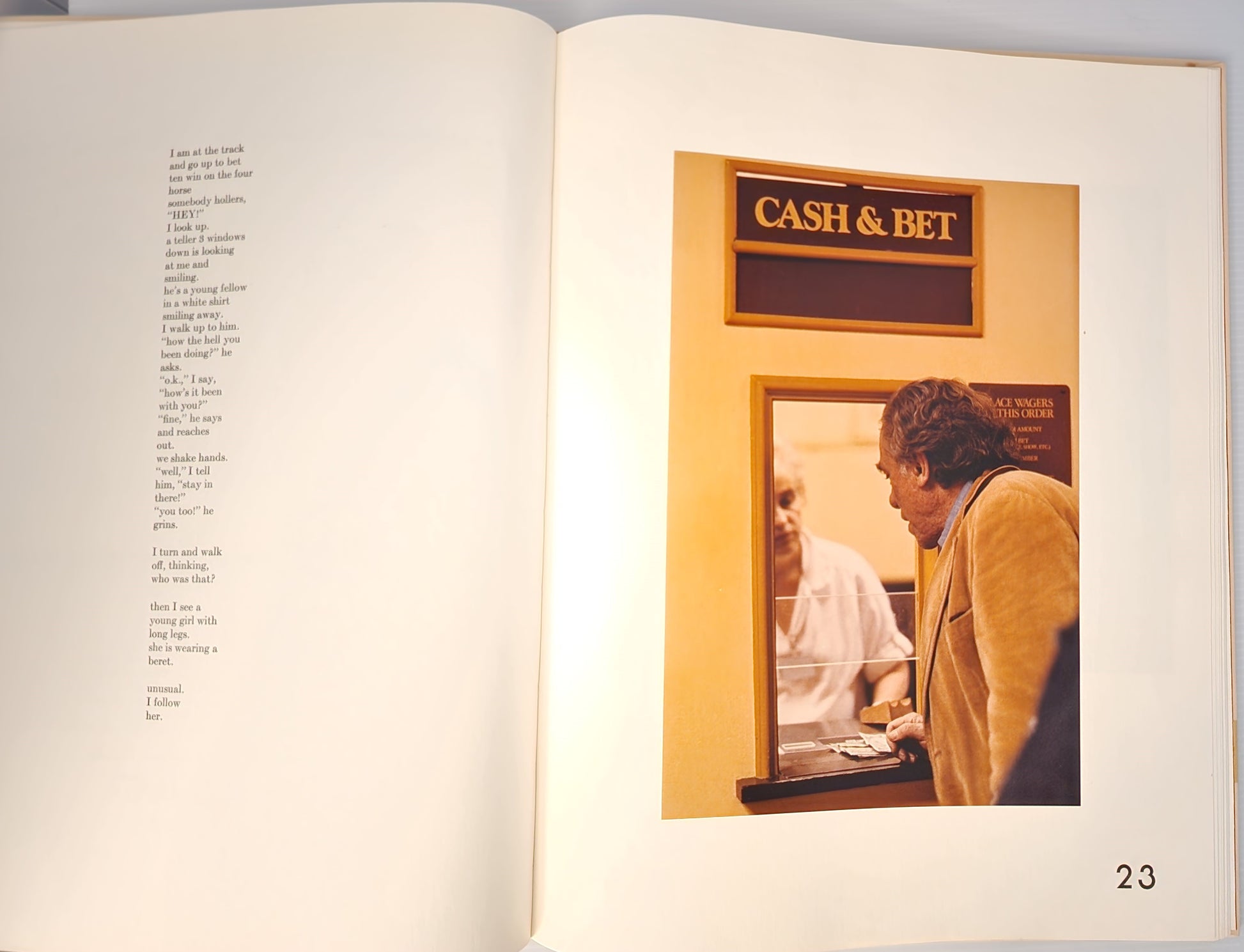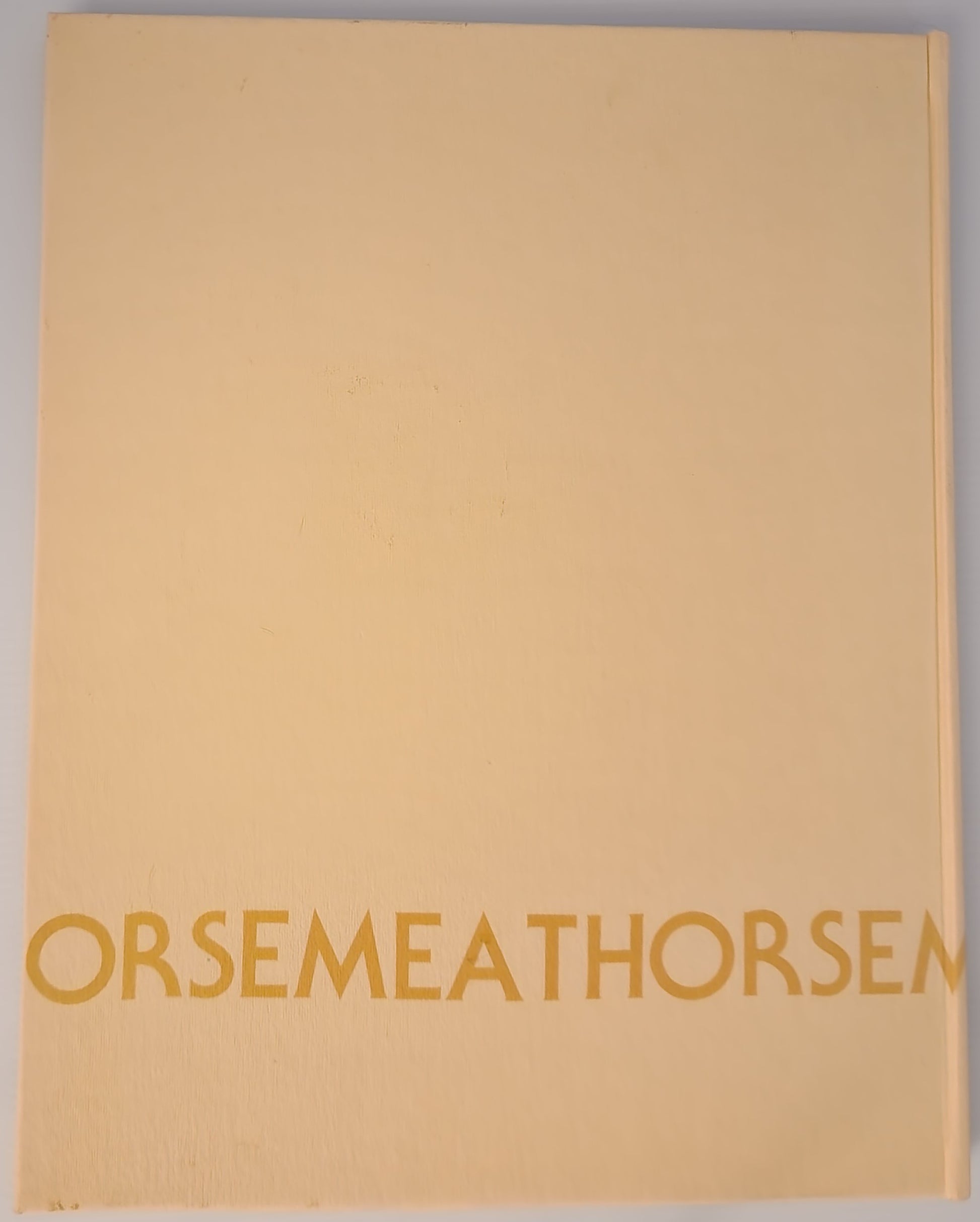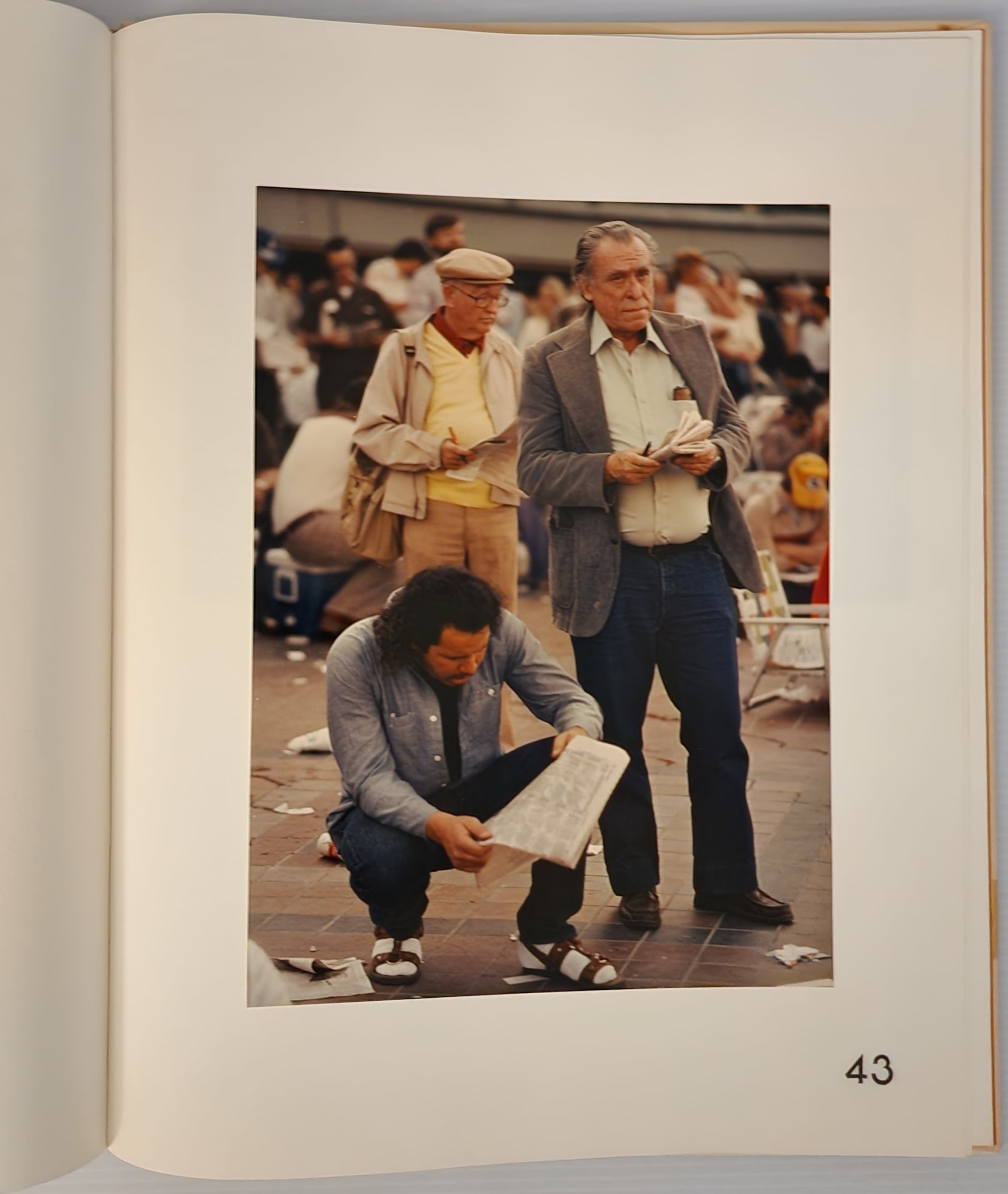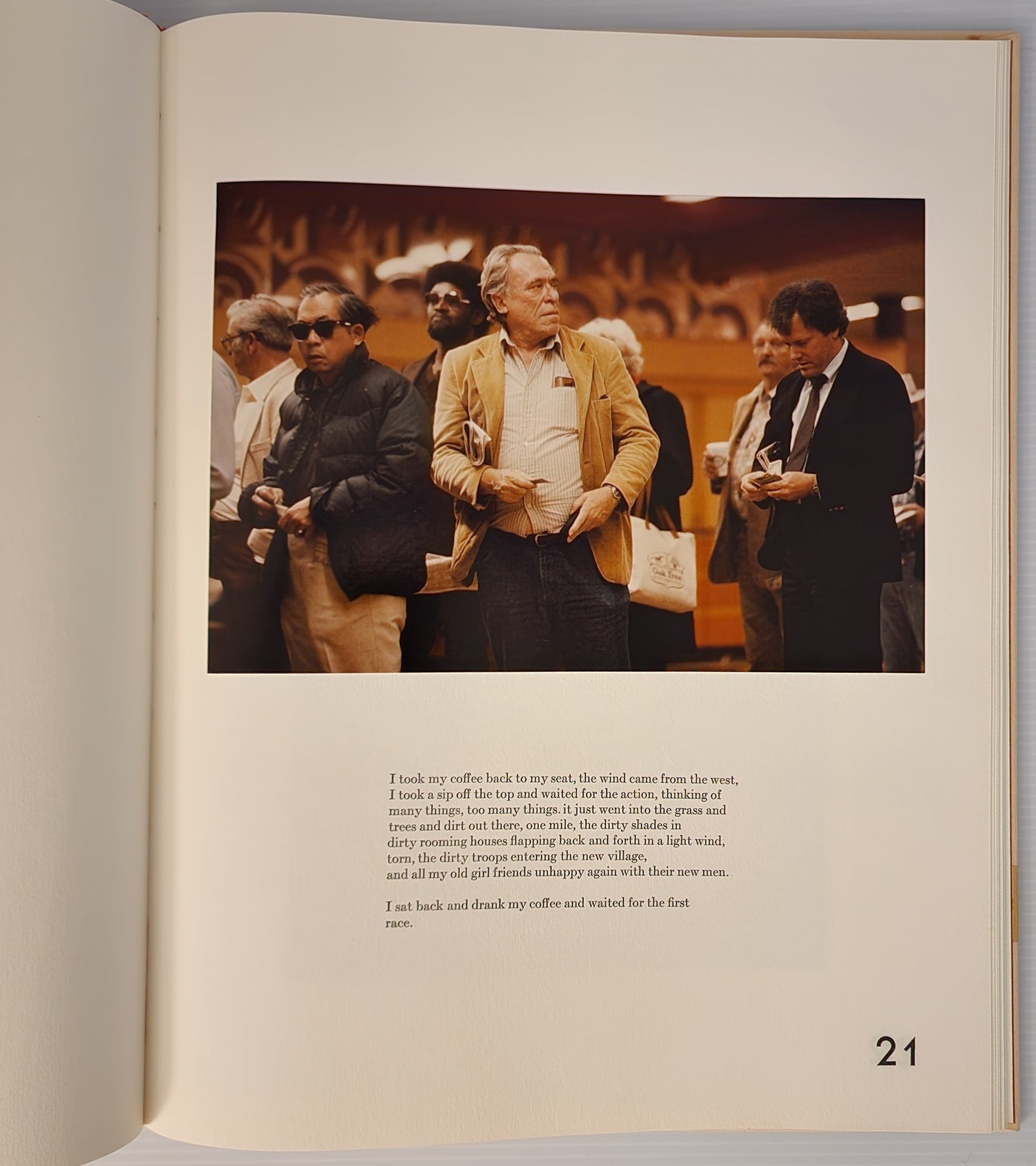 Published in 1982, Horsemeat contains 20 tipped-in photographs capturing a day at the track with Bukowski. It measures approximately 11.25” x 14 .25” and runs 50 pages. There is also a mounted photograph of Bukowski on the front cover.