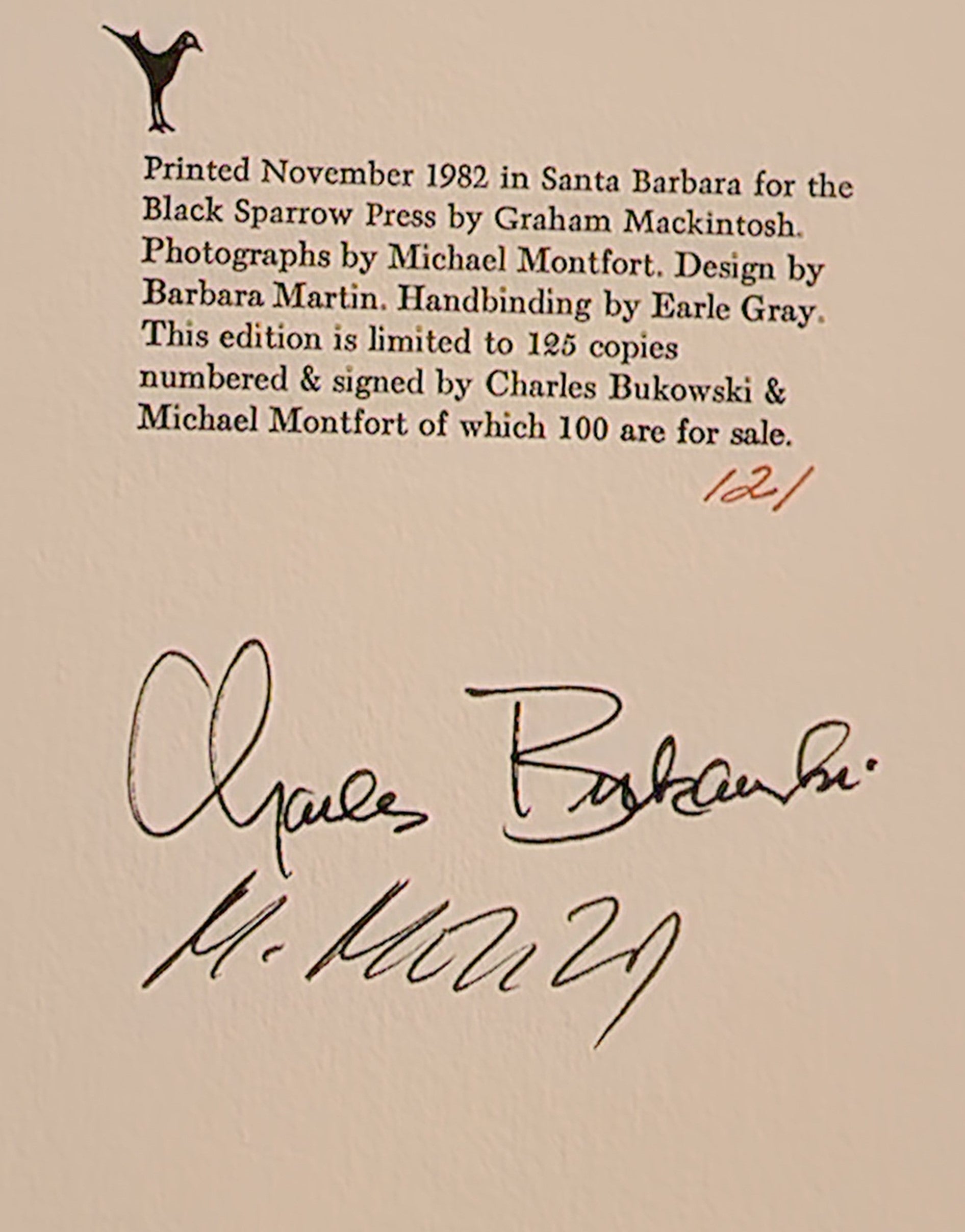 This edition is limited to 125 copies numbered and signed by Charles Bukowski & Michael Montfort of which 100 are for sale.