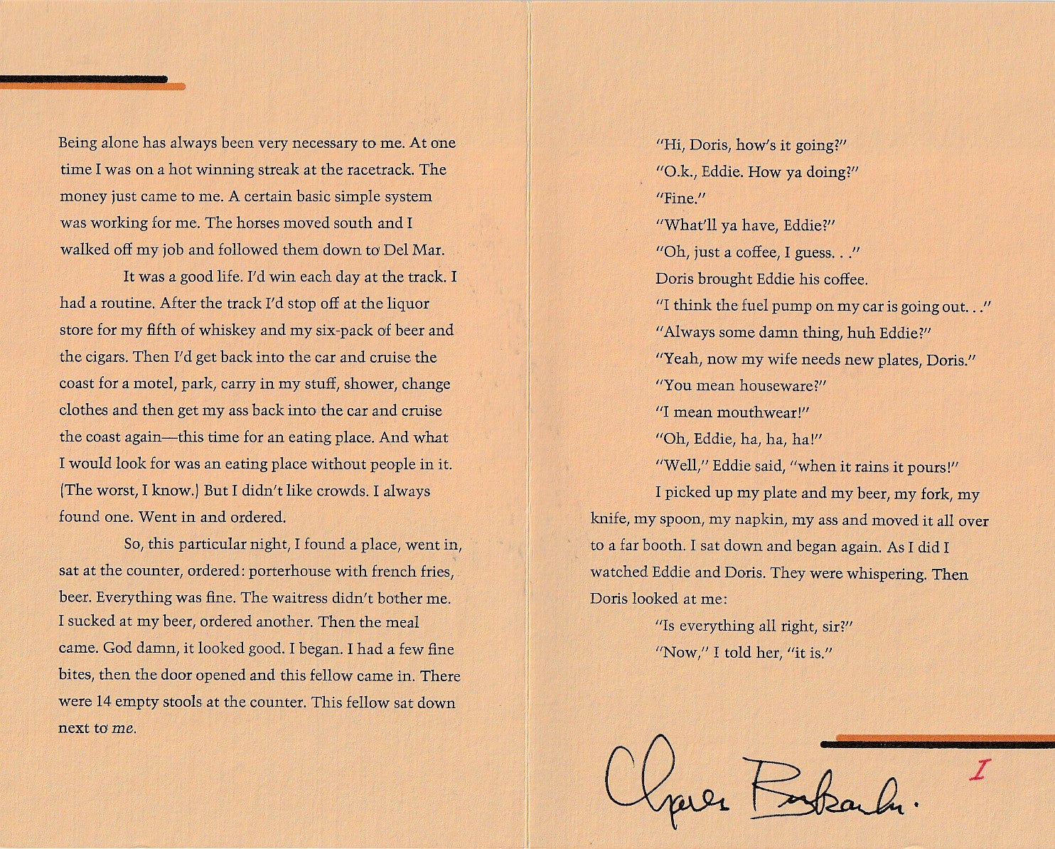 This copy also comes with the publisher’s signed book prospectus. Only 26 lettered copies were signed, this one being the letter “I”. It’s a four-page booklet measuring 8” x 5" and has a tipped in photograph of Bukowski on the front. It has text from the book on the inside and the edition information on the back page.