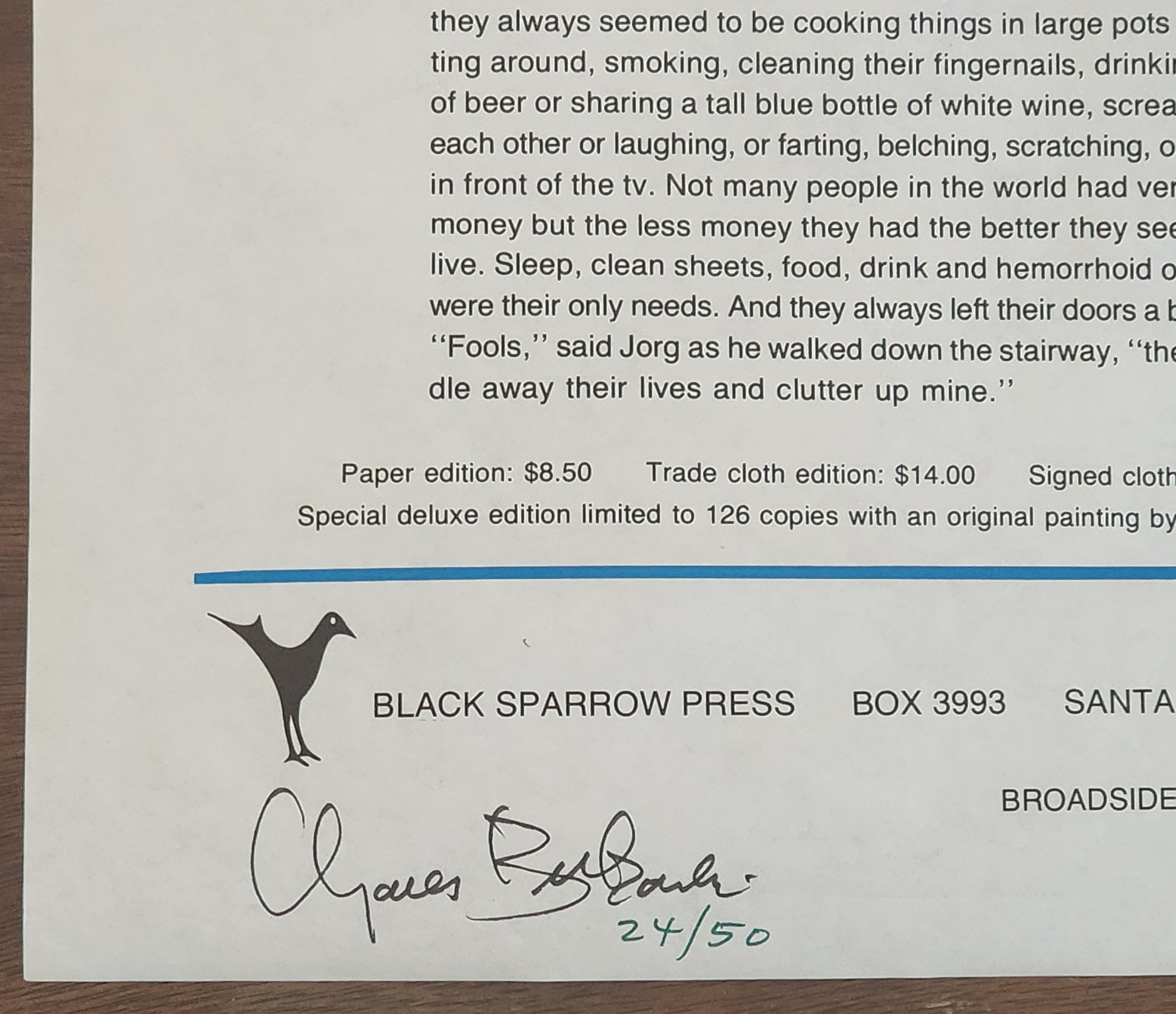 This is an unfolded, signed broadside/announcement for the book. It is #24 of only 50 numbered and signed copies. It includes and excerpt from the book and measures 10" x 17".