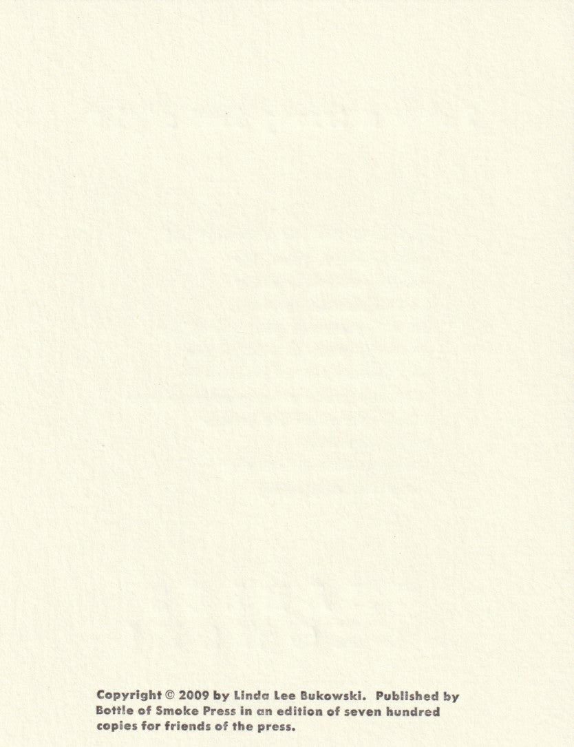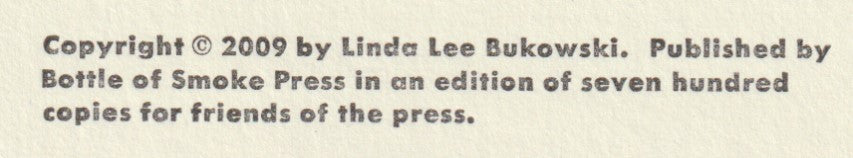 Here’s another beautifully produced broadside by the legendary Bill Roberts and his Bottle of Smoke Press. Bottle of Smoke Press has produced eight Bukowski broadsides since 2003, as well as countless other artists.