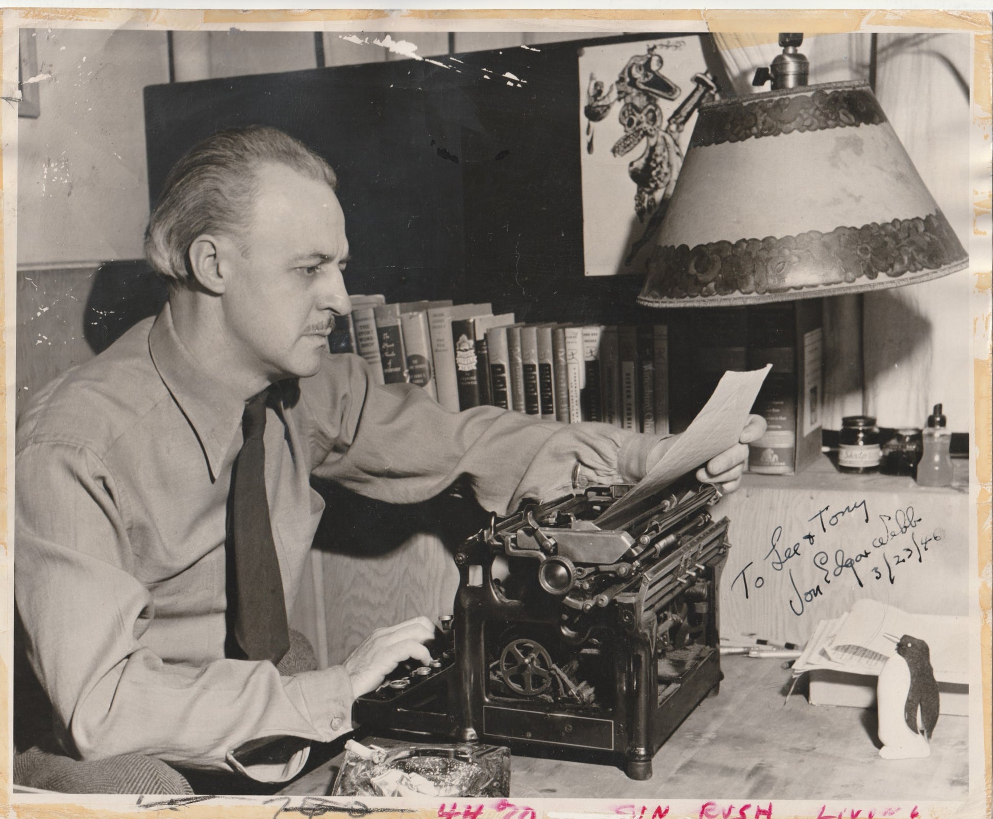 As the back of the photograph indicates, the photograph spent time in a newsroom and was used for his obituary in 1971. The clipping only contains a portion of the obituary.