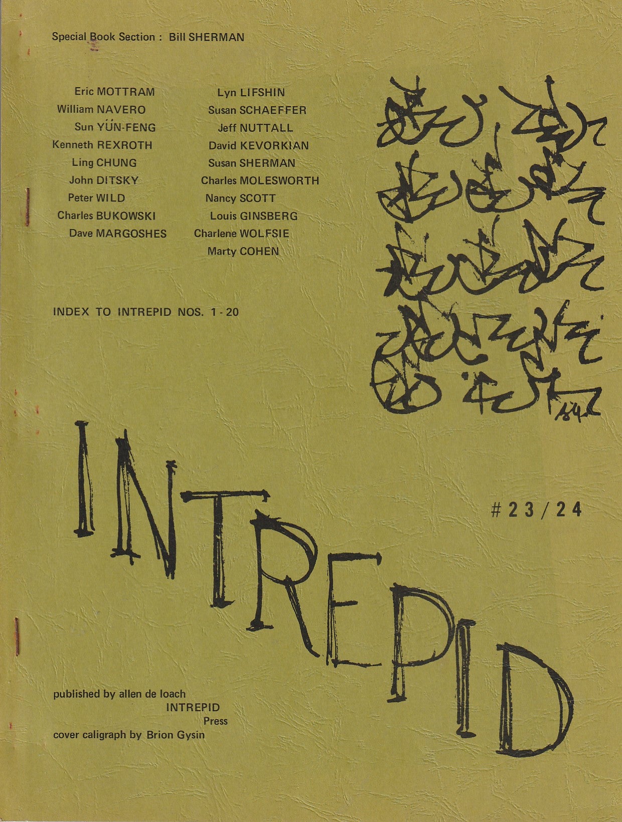 Edited by Allen De Loach in New York (issues 1-5) and then Buffalo (issues 6-41), Intrepid (1964-1980) published a large number of poets directly and indirectly associated with the New American Poetry, and especially Beat writers. Contributors included a long list of such influential figures as Allen Ginsberg, Gregory Corso, LeRoi Jones (Amiri Baraka), Philip Whalen, William Burroughs, Diane di Prima, Charles Bukowski, Ted Berrigan, Gary Snyder, Ted Enslin, and Charles Olson.