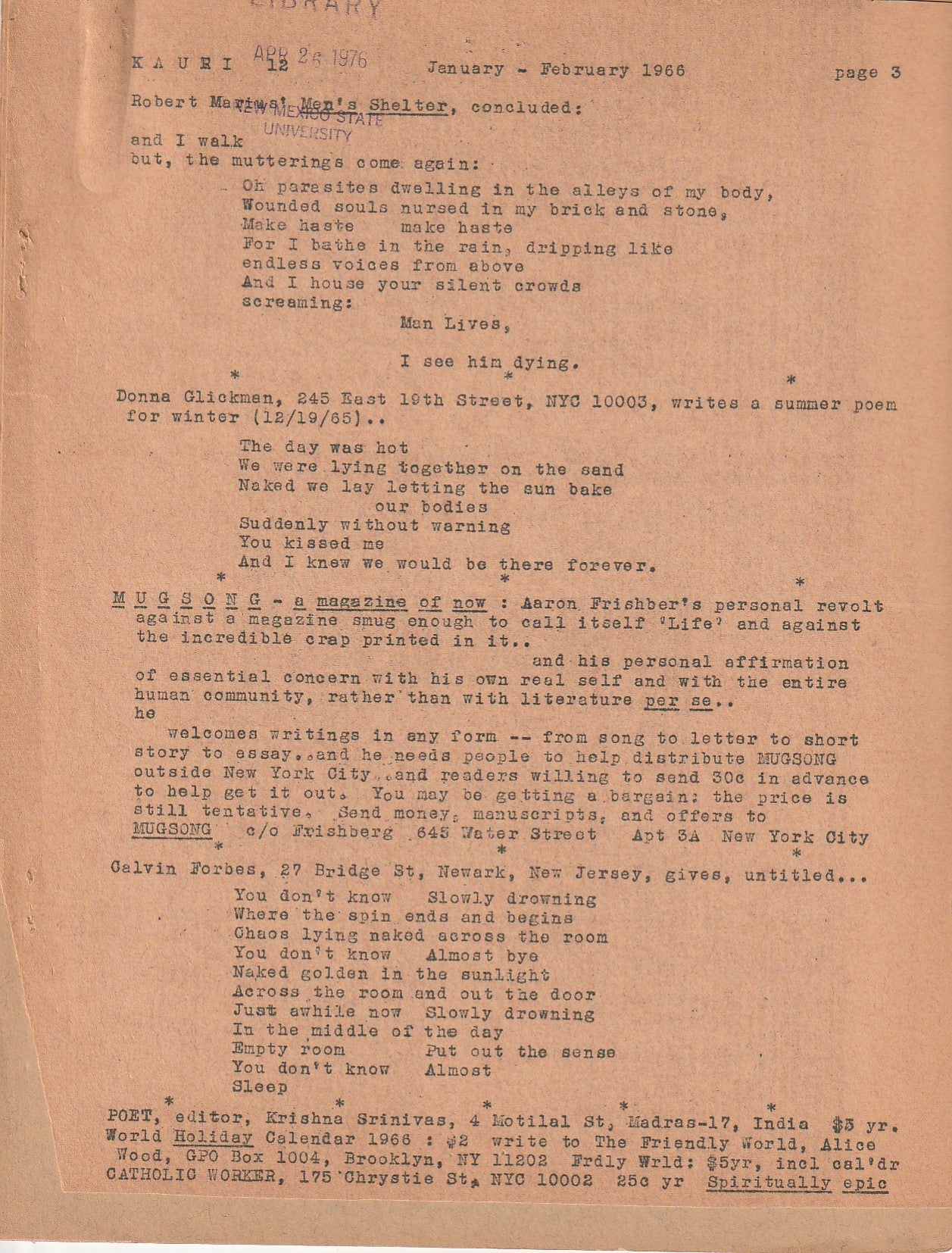 Published in 1966, Kauri No. 12 (January/February) does not contain a Bukowski poem, but there is a funny letter to the editor referencing Bukowski. It’s odd because Inman added strips of paper by hand to cover up some contents of the letter that seem of little importance.
