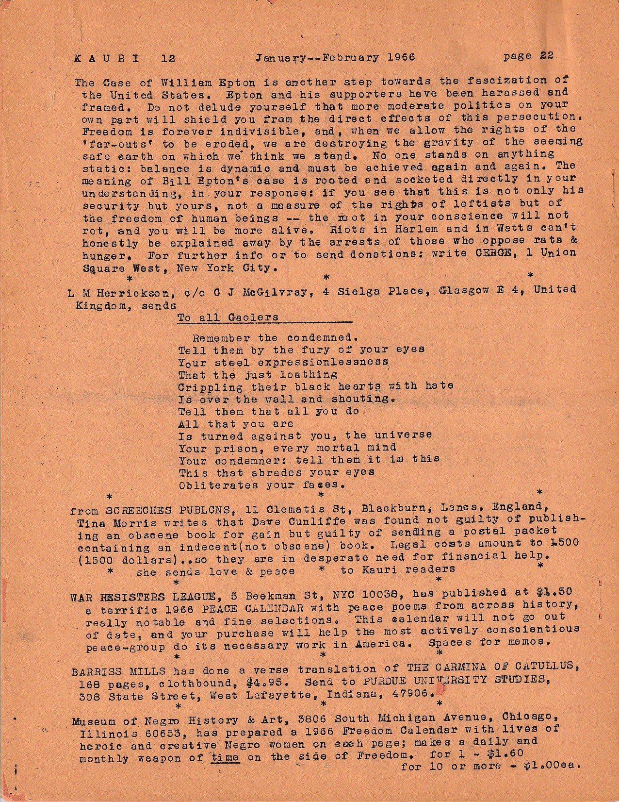 Kauri No. 12 -- Letter to the Editor Referencing Charles Bukowski (1966)