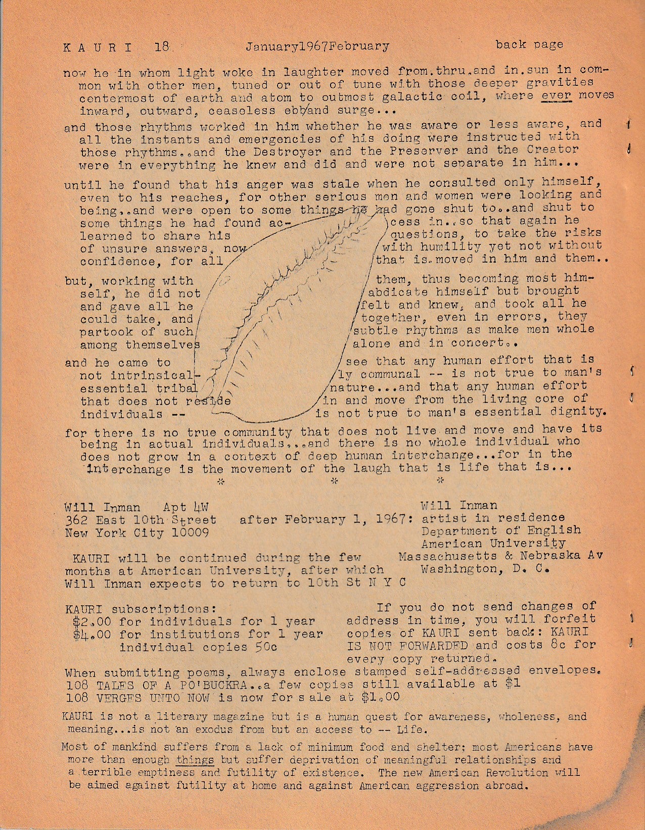 Inman didn’t particularly care for Bukowski’s poetry, but he felt his poems balanced out the various poetry schools of poets who appeared in Kauri. If nothing else, Bukowski (who contributed to eight issues of Kauri) was certainly entertaining with various letters and raw poems that appeared in Kauri.