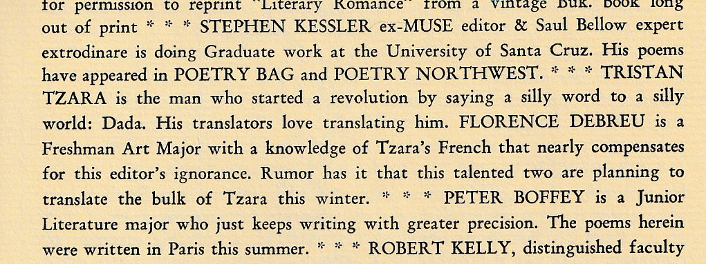 Contributors include Bukowski, Creeley, Mac Low, Enslin, Tzara, Carruth, et al.