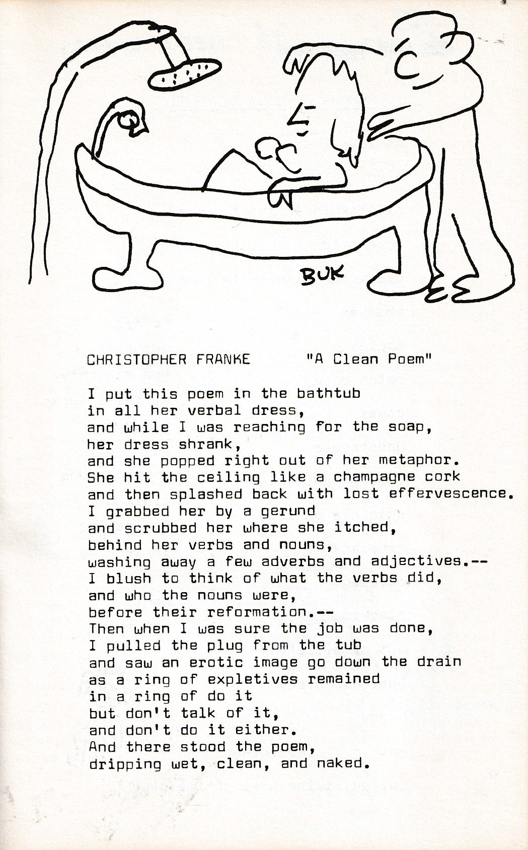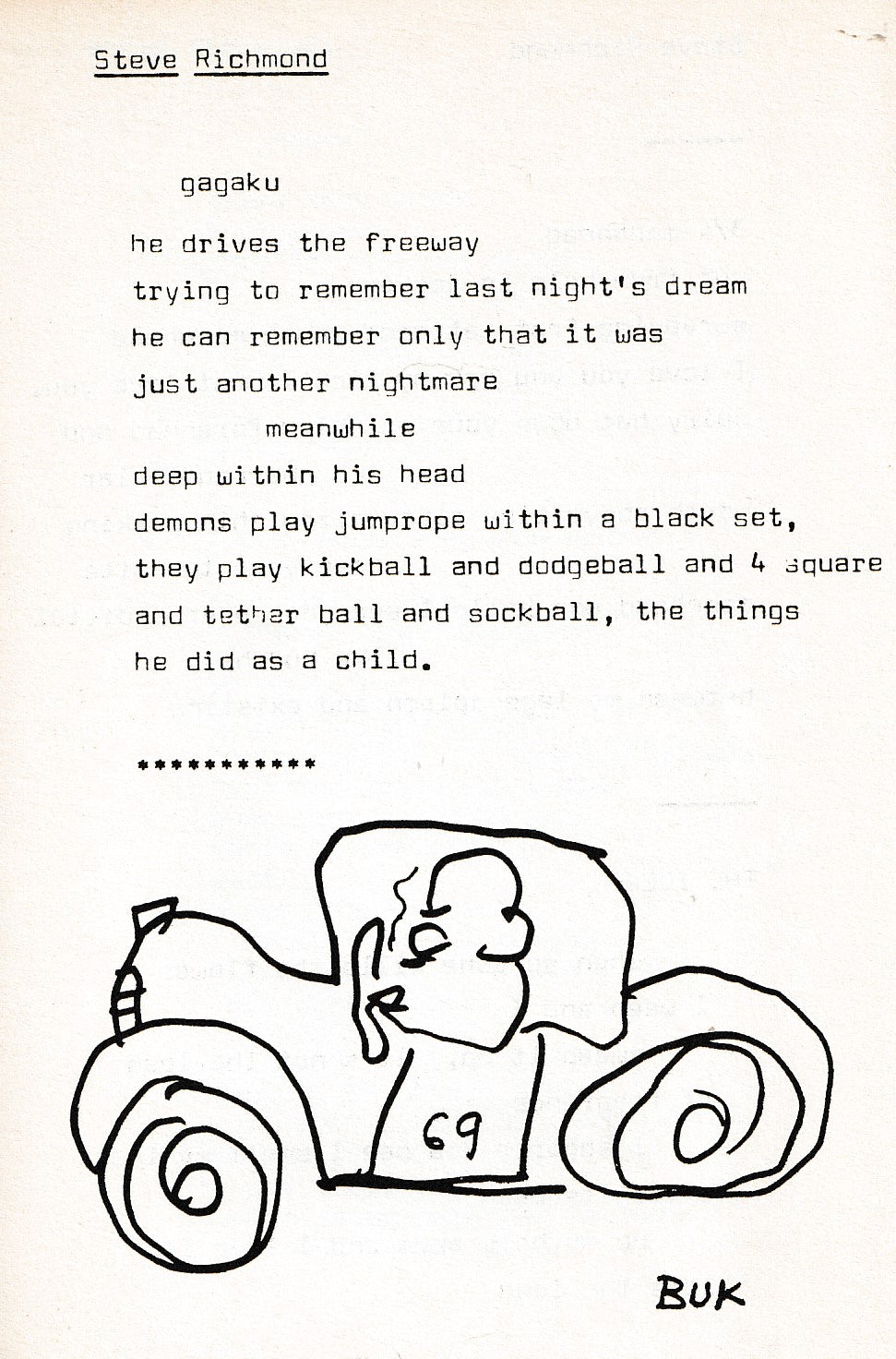 While Bukowski didn’t attach his names to any poems in this issue, there are four Bukowski drawings and three letters. There is also a letter from Carl Weissner to Bukowski. The rest seem to be poems by Harold Norse, Steve Richmond, and Neeli Cherry.