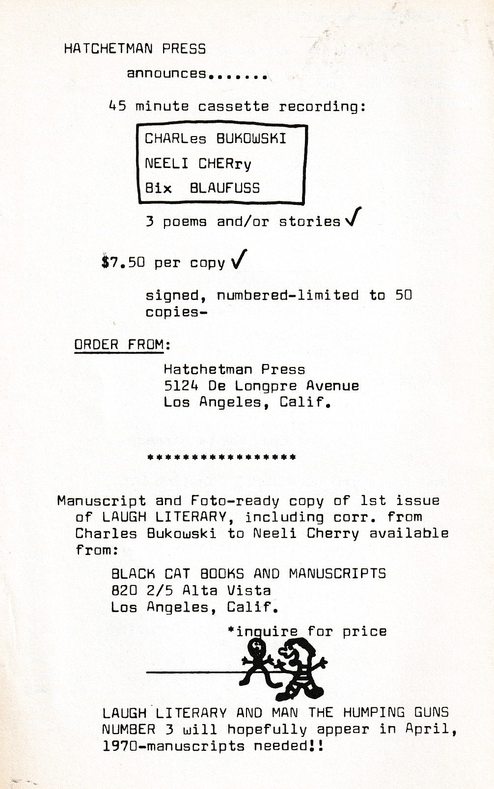Published in 1969, Laugh Literary And Man The Humping Guns No. 2 was the second of three issues published by Bukowski and Neeli Cherry.