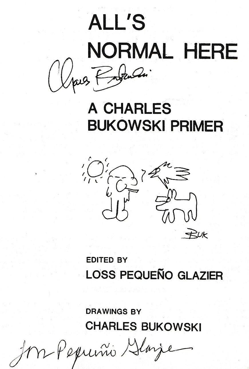 This is a signed copy of All’s Normal Here. This is a special copy, #24 of a total of 27 copies signed by Bukowski and editor J. Glazier.