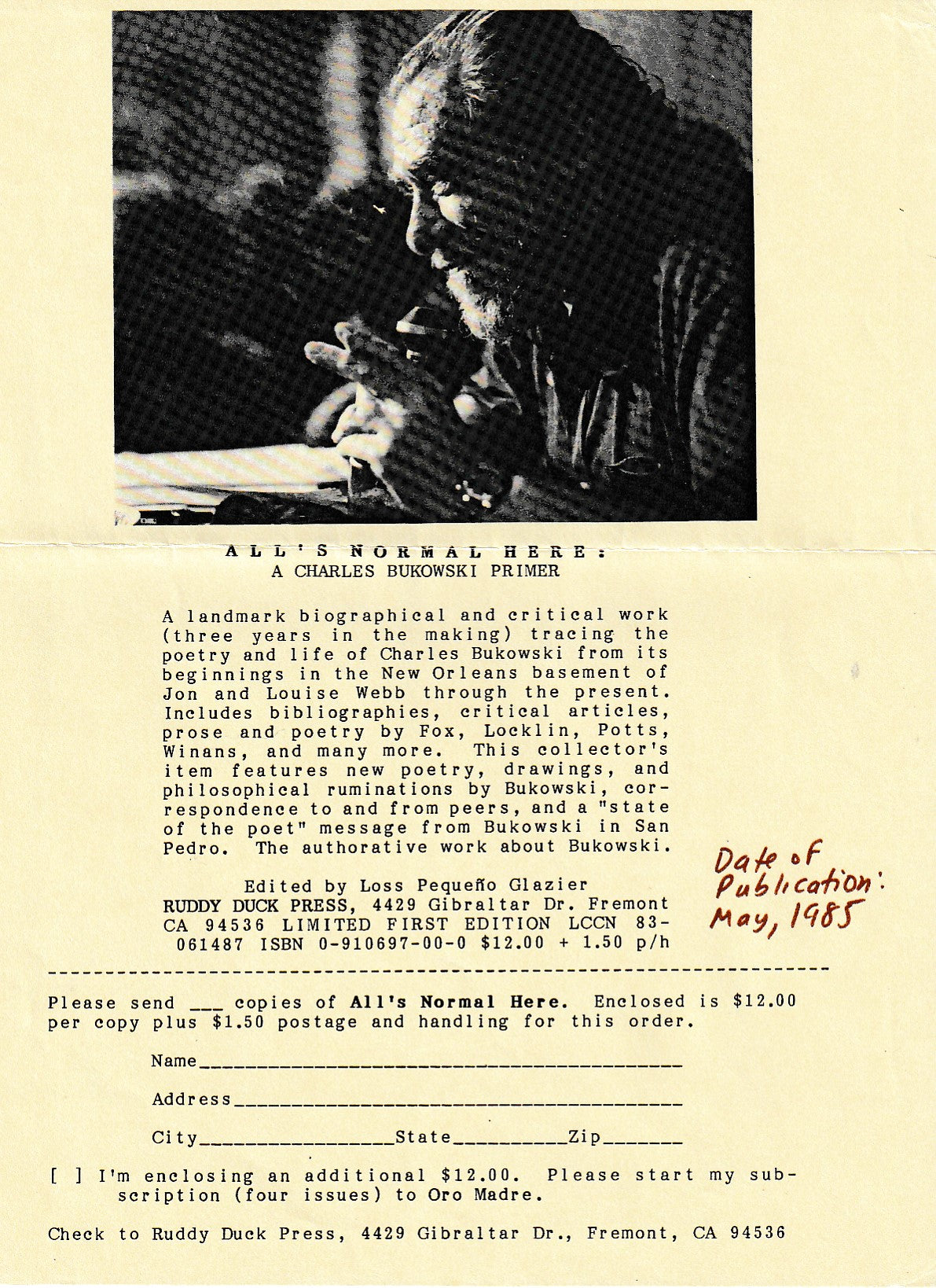 Also tipped in is an order form for the book that includes a photograph of Bukowski at a reading. There’s a hand-written note concerning date of publication, May 1985.