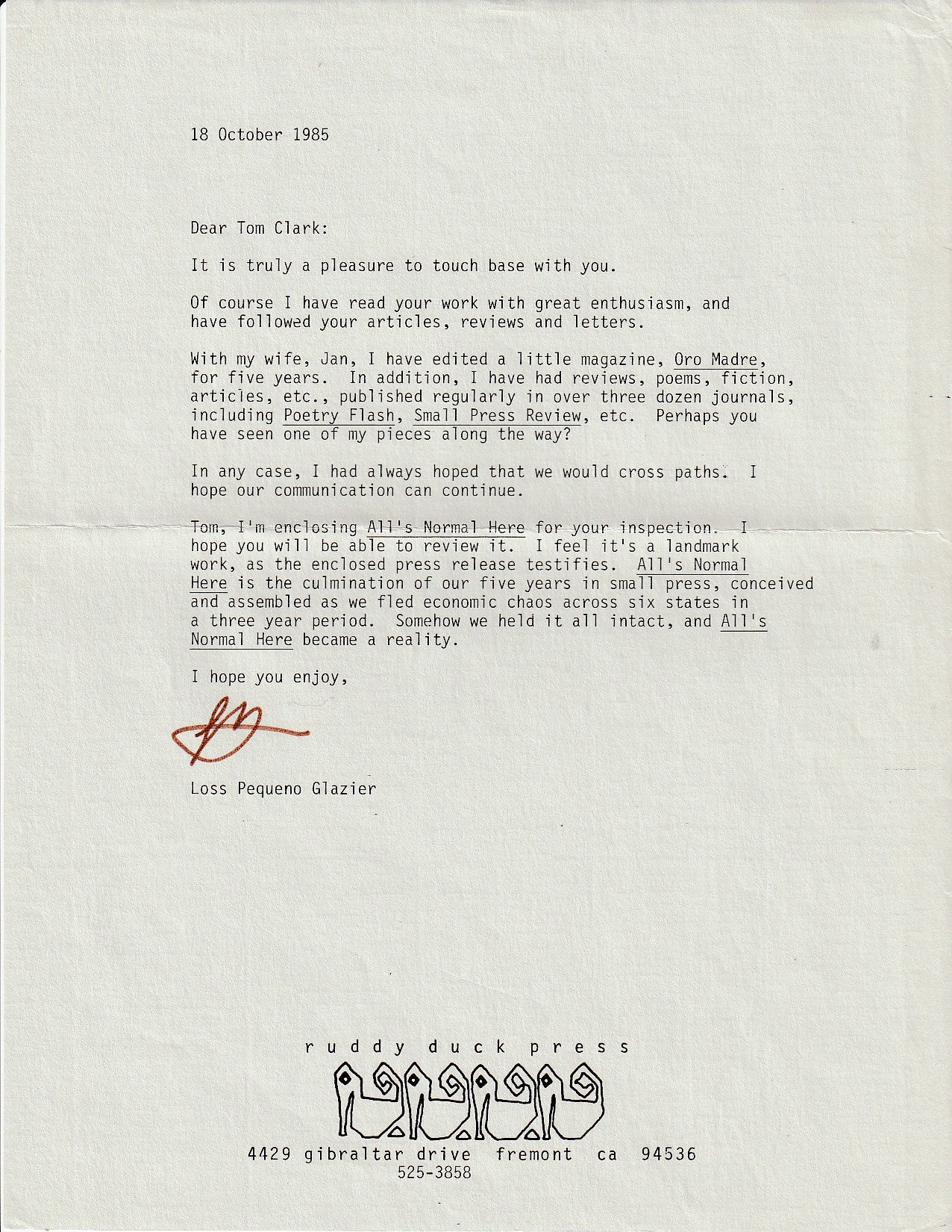 Published in 1985, All’s Normal Here (technically Oro Madre Vol. 4, No. 1-4), was published by Glazier’s Rudy Duck Press. Glazier included Bukowski in two issues of his poetry journal Oro Madre, as well as the chapbooks Going Modern and All's Normal Here.